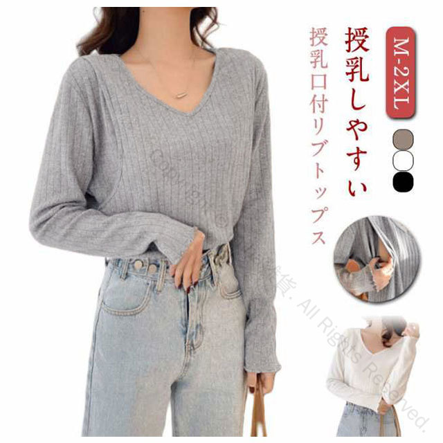 Tシャツ カットソー リブ 授乳服 マタニティ 授乳口付トップス 春 インナー Vネック おしゃれ 薄手 マタニティウエア 長袖 シンプル 大きいサイズ リブトップス プルオーバー