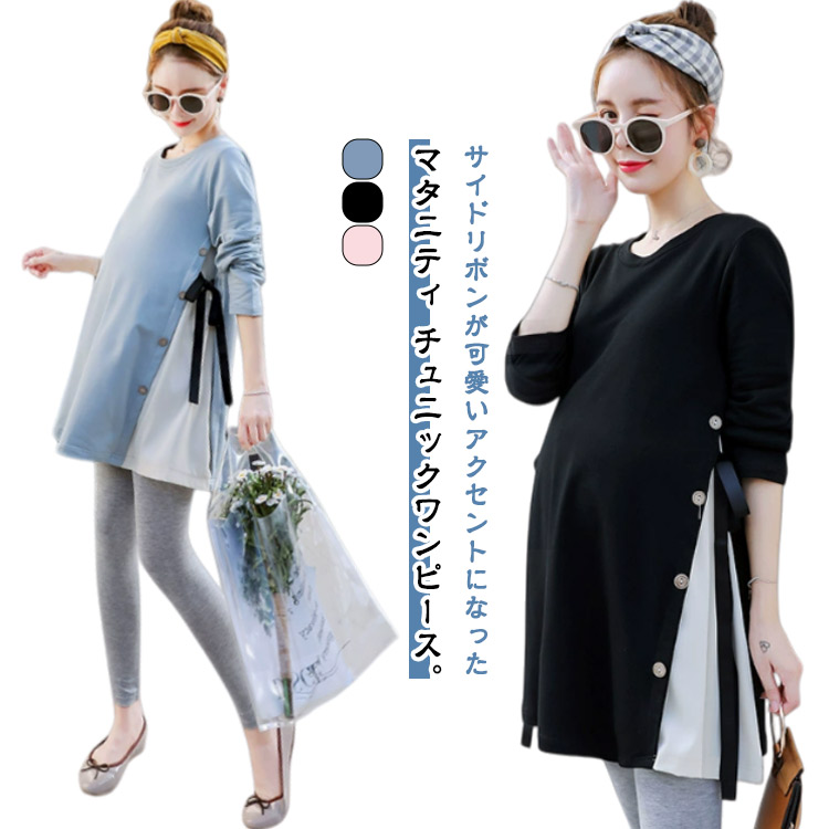 サイドリボン トップス チュニック ワンピース 長袖 妊婦服 クルーネック 産後 秋 Tシャツ かわいい 産前 春 冬 マタニティ ロンT 大きいサイズ 着痩せ きれいめ カジ 体型カバー