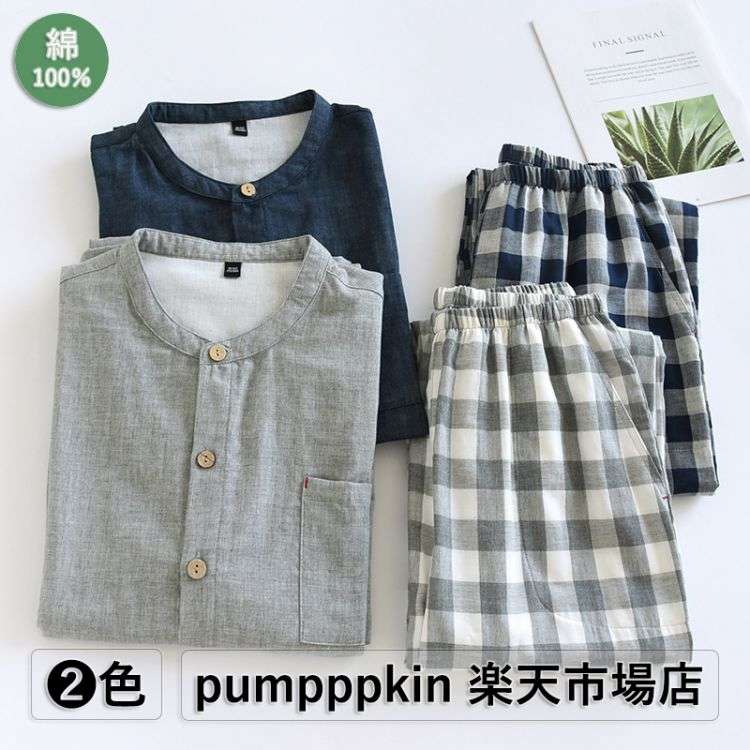 ダブルガーゼ パジャマ メンズ 長袖 薄手 チェック柄 ルームウエア 綿100% 生地 春 秋 物 ガーゼ スタンドカラー パジャマセット 上下2点セット トップス+ズボン 部屋着 前開き 大 寝巻き
