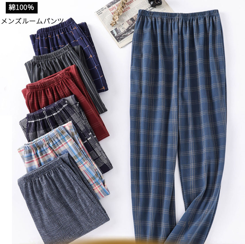パジャマ ズボンメンズ チェック ルームウェア パンツ コットン 男性 ルームパンツ ナイトウェア ボトムス 湯上りパンツ 薄手 部屋着 ルームウエア 寝ズボン 肌に優しい 通気 二重ガーゼ