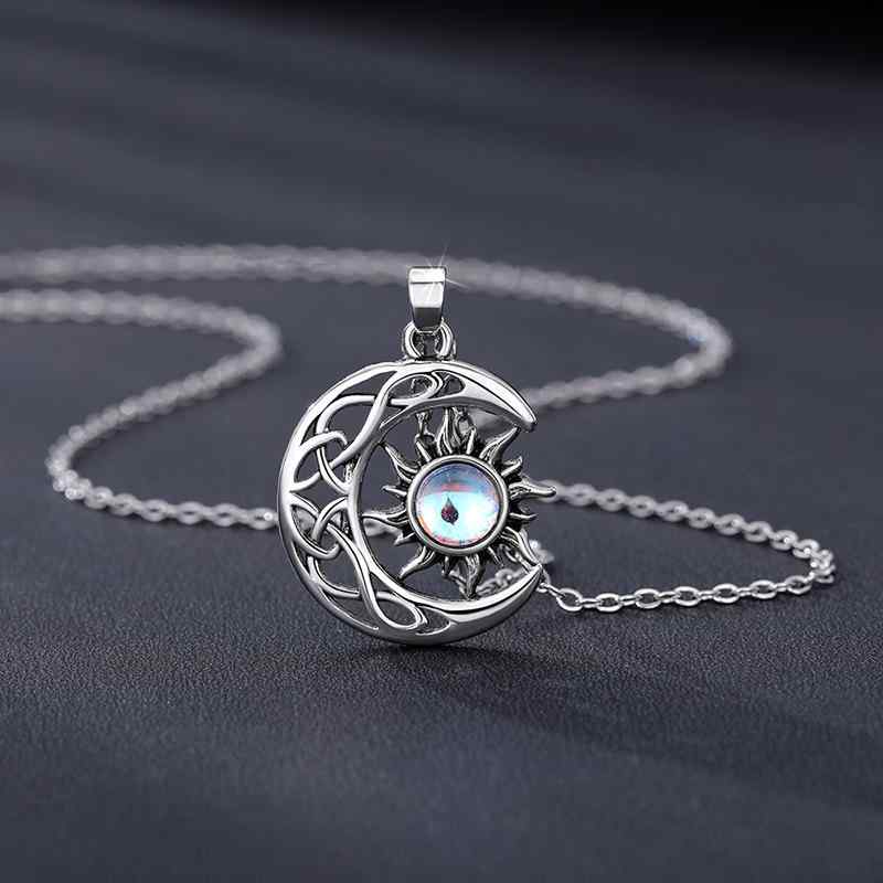 ネックレス ユニセックス 太陽 月 モチーフ ペンダント 銅製 フェイク月光石 レトロ ヴィンテージ 幾何学デザイン チョーカー 春夏 普段使い プラチナカラー