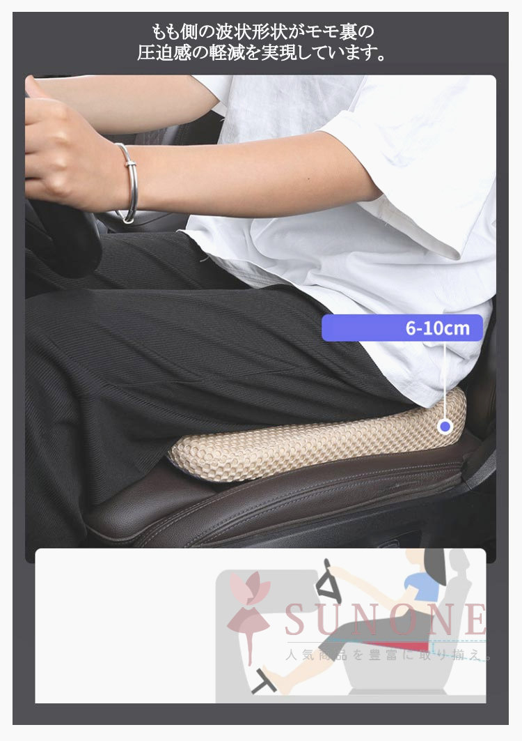 6cm/8cm/10cmから選べるシート高さ調整機能。車専用設計の傾斜形状で正しい運転姿勢をサポートし、運転疲れを軽減。太もも側の波状形状がモモ裏の圧迫感を軽減。固定用バックルベルトと裏面滑り止め付き。