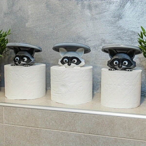 お風呂場がたちまち楽しい空間に大変身!3Dプリント技術で精巧に作られたアライグマのトイレットペーパーホルダーが登場です。蓋付きで衛生的ながらも、ユーモアあふれるデザインが特徴。トイレットペーパーをアライグマが大事そうに抱えているような愛らしい姿は、毎日の生活にほっこりとした笑顔を届けてくれます。