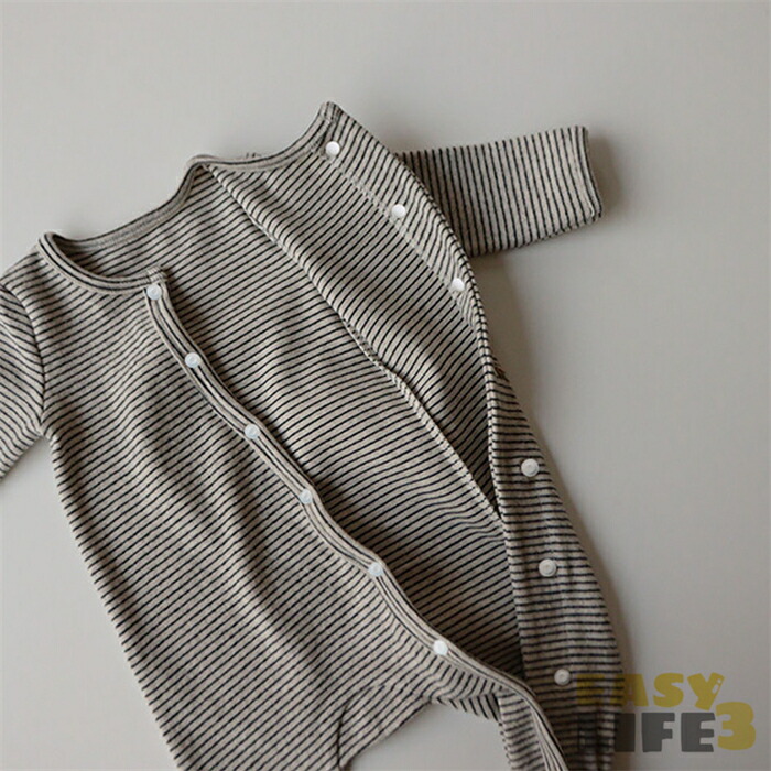 ベビー服 ロンパース カバーオール 男の子 女の子 春秋 ボーダー 横縞 長袖 足つき 開襟 スナップボタン 着脱便利 柔らかい 着心地いい 普段着 寝間着 室外着 ルームウエアー パジャマ 室内着
