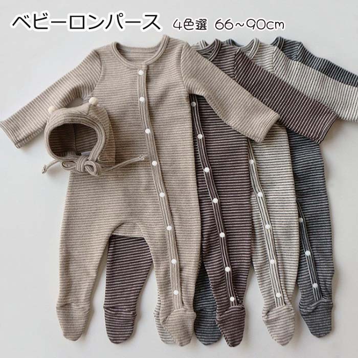 ベビー服 ロンパース カバーオール 男の子 女の子 春秋 ボーダー 横縞 長袖 足つき 開襟 スナップボタン 着脱便利 柔らかい 着心地いい 普段着 寝間着 室内着 室外着 ルームウエアー パジャマ ベビーウェア 出産祝い スリープウェア プレゼント ギフト お祝い かわいい キュート 新生児 赤ちゃん ベビー 男女兼用 66-90cm 4色選
