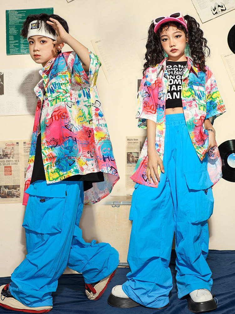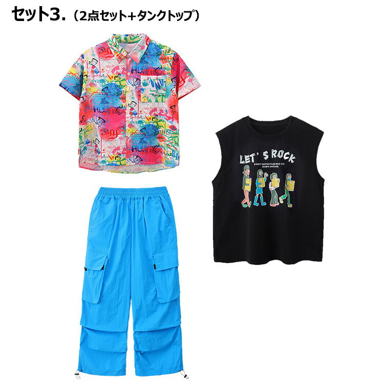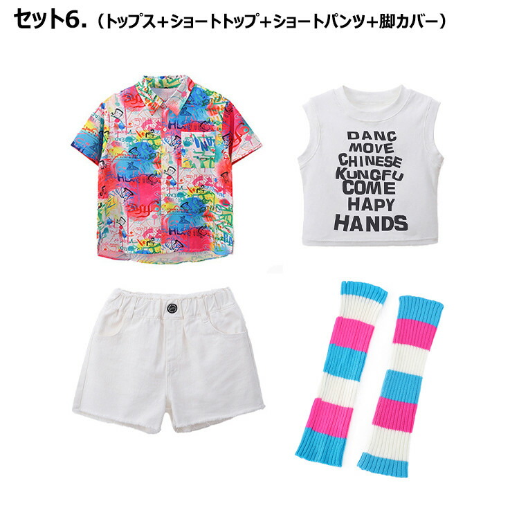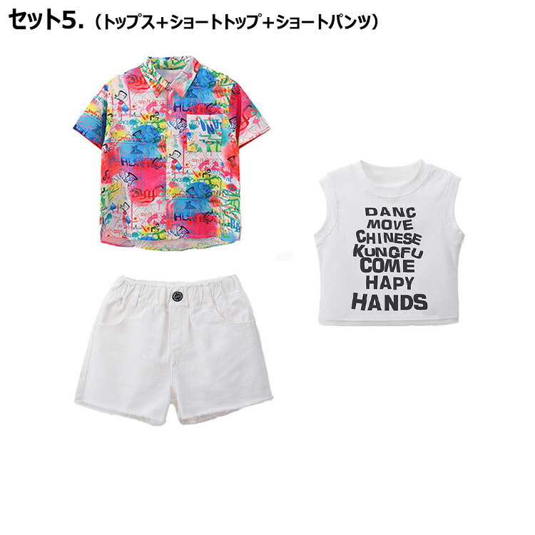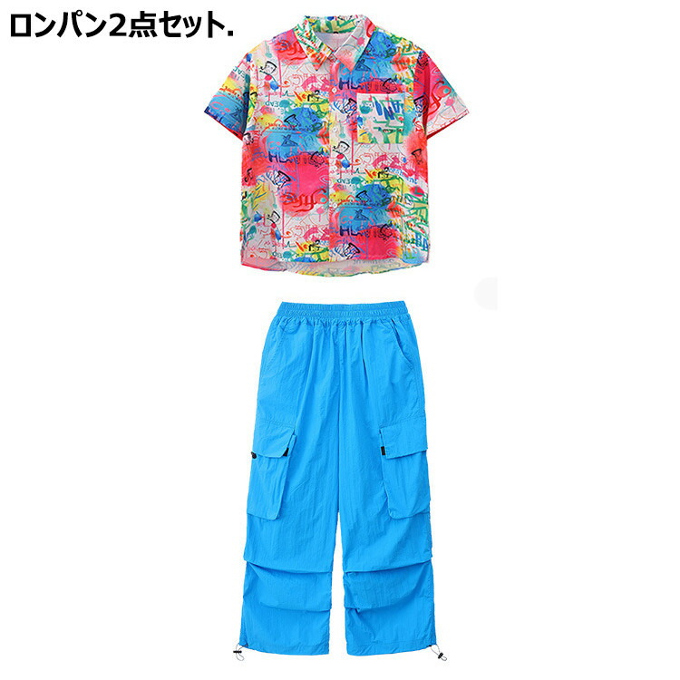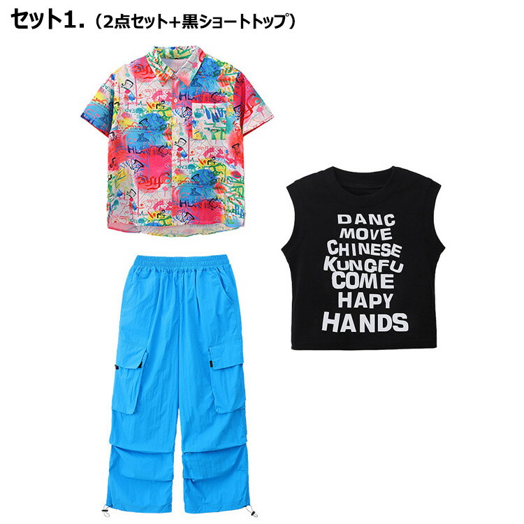 虹色 柄シャツ 総柄 女の子 チア 青色 キッズ ダンス衣装 セットアップ 半袖 シャツ 男の子 黒 タンクトップ へそ出し トップス 白 ショートパンツ ヒッフポッフ ジャズダンス 韓 ワイドパンツ