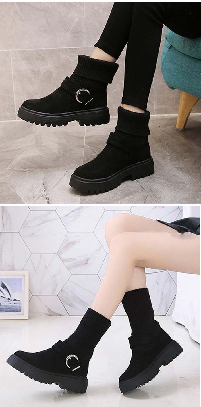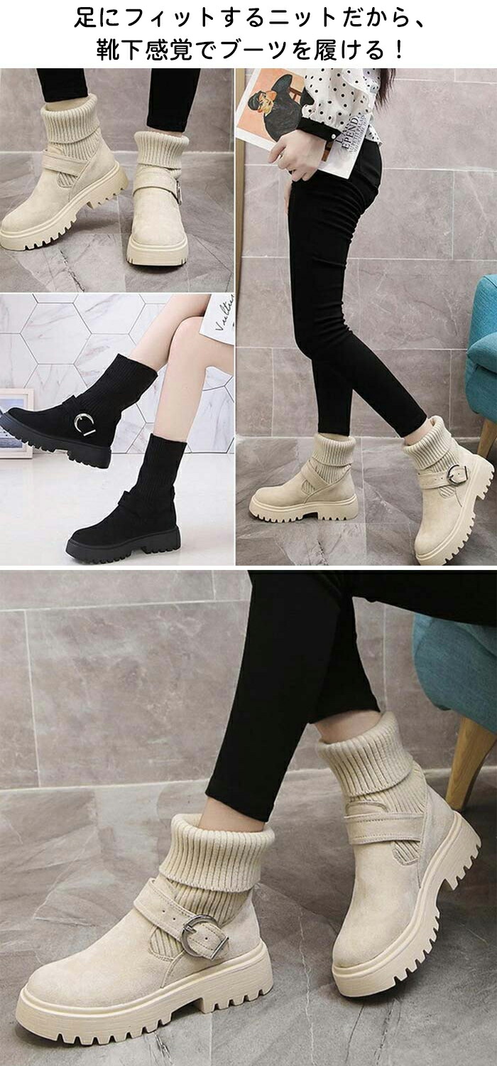 ソックス風 ショートブーツ レディース 2wayニットブーツ バックルベルト 厚底ブーツ 歩きやすい ハイカット ブーツ おしゃれ