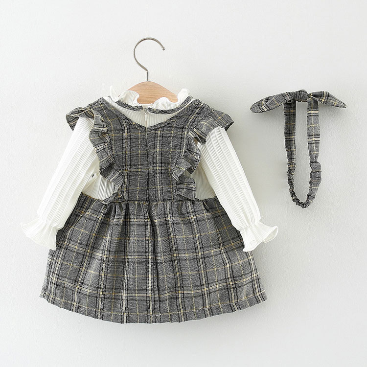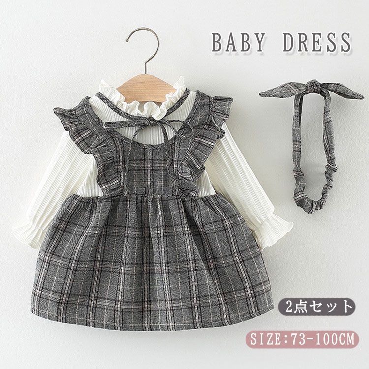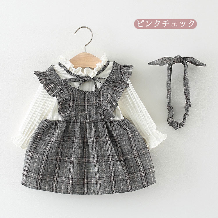 ベビー 女の子 ワンピース 長袖 チェック ワンピ 2点セット 子供服 子 赤ちゃん ベビー服 ヘアバンド グレー リボン フレア シンプル カジュアル 秋 フォーマル 七五三 卒園式 冬