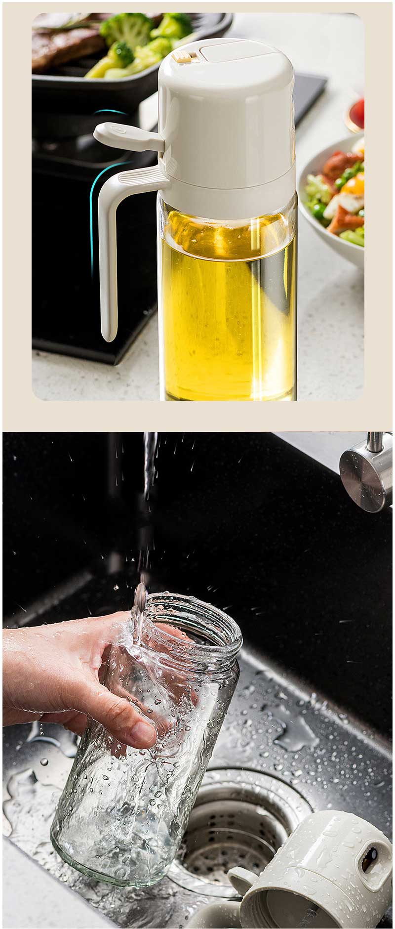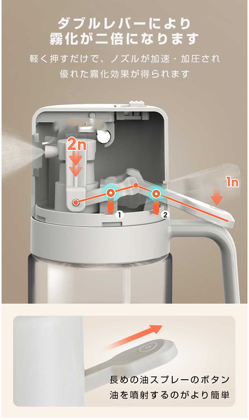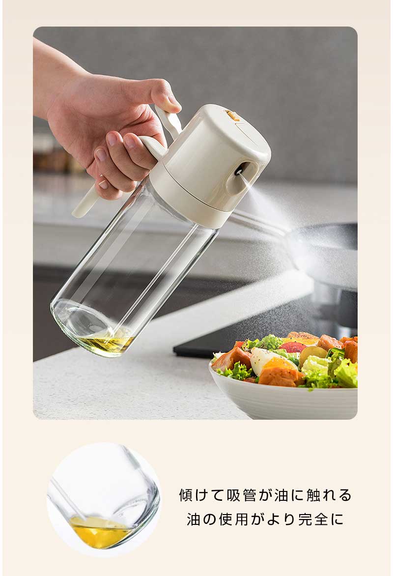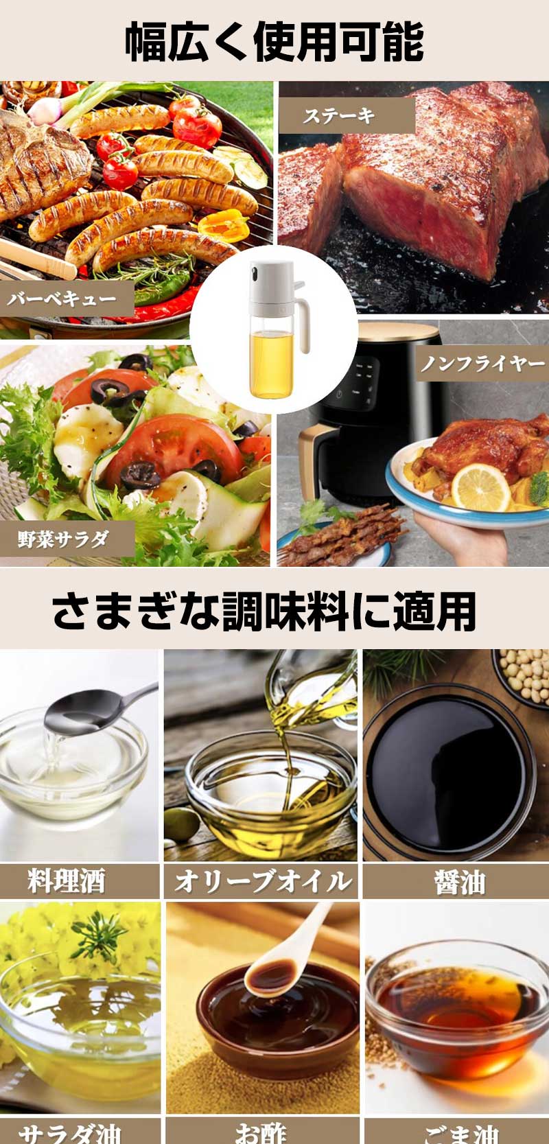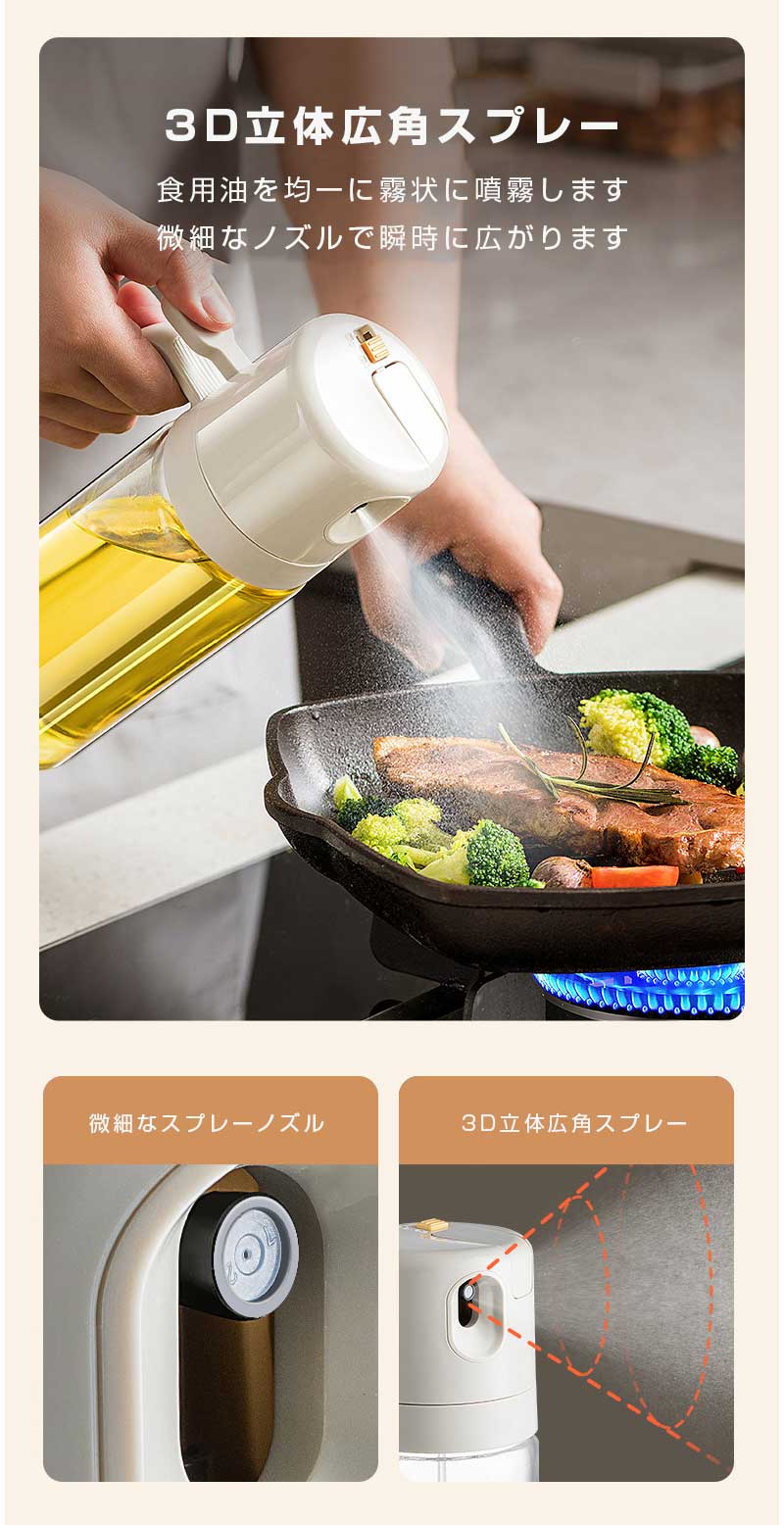 密閉性を高め、液漏れを防ぐリークプルーフデザインをアップグレードしました。 大口径のボトルは、漏斗を使わなくても食用油を簡単に入れることができます。 この必要不可欠なキッチンガジェットはとても便利で、ボタンを押し続けるだけで、細かいミストを噴出します。