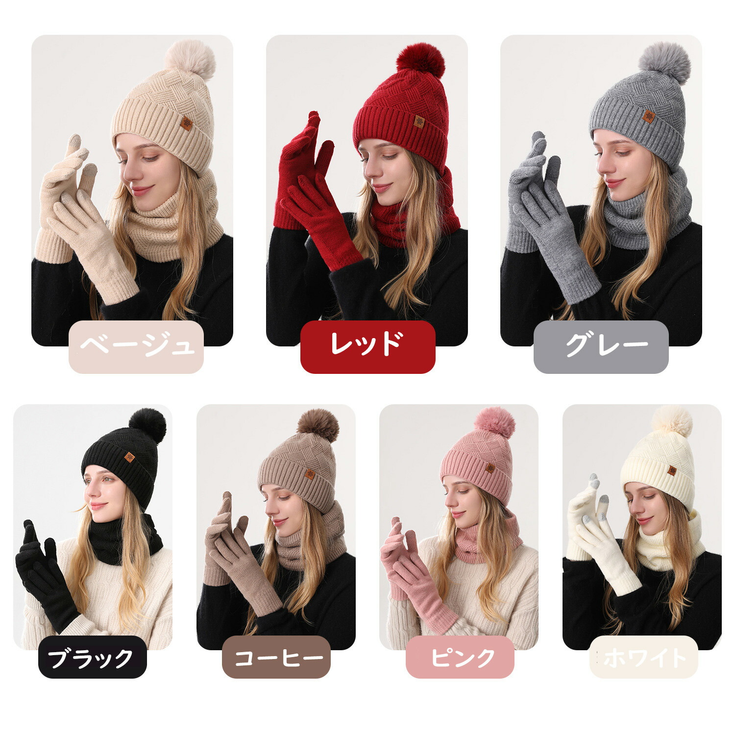 ニット帽+マフラー+手袋 防寒手袋 冬 帽子 レディース帽子 ニット帽 通販 ベージュ レッド グレー ブラック コーヒー ピンク ホワイト