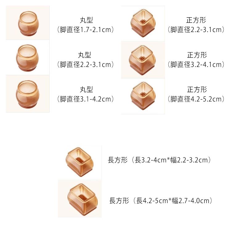 椅子脚カバー 傷防止 丸脚 角脚 正方 ブラック ホワイト 茶色 丸型(脚直径1.7-2.1cm) 丸型(脚直径2.2-3.1cm) 丸型(脚直径3.1-4.2cm) 正方形(脚直径2.2-3.1cm) 正方形(脚直径3.2-4.1cm) 正方形(脚直径4.2-5.2cm) 長方形(長3.2-4cm*幅2.2-3.2cm) 長方形(長4.2-5cm*幅2.7-4.0cm)