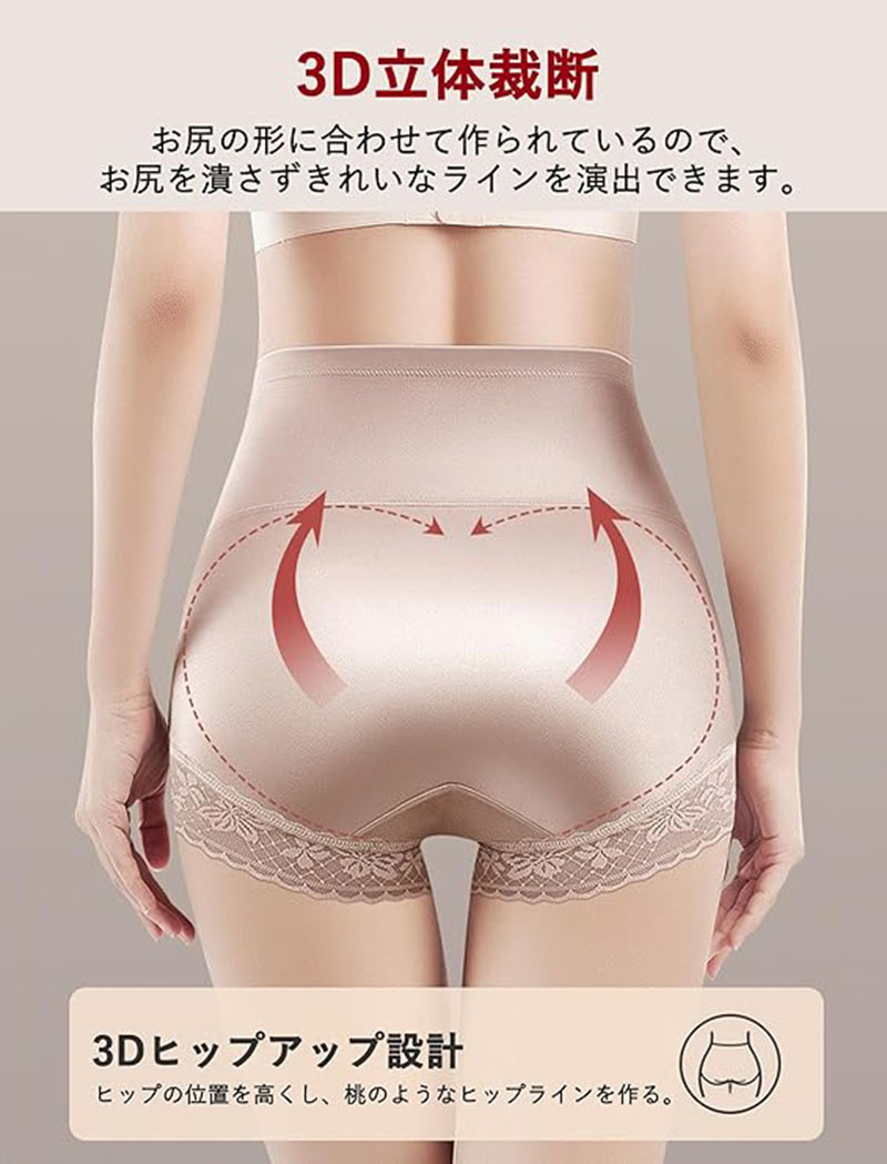 【立体裁断・ヒップアップ】3D立体裁断を採用することでお尻の形に合わせて作られており、レディース ヒップアップショーツを履くだけではみ出してしまうお肉を整えたり、垂れてきたお尻をキュッと上げたりして、お尻を潰さず桃のような丸いお尻のラインを作ります。すっぽり包み込む立体パターンでお尻についてしまった段差や食い込みも解消します。ヒップの位置が高く見えるので、脚長効果もあり、後ろ姿が若々しくなります。