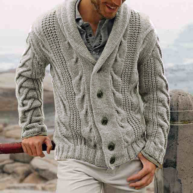 春秋冬に重宝する男性用ショールカラーニットカーディガンが登場。