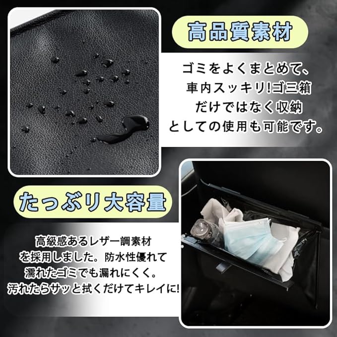 【高耐水性】防水仕様で、液体のゴミを捨てても漏れることなく安心です。汚れた場合も簡単に水拭きでお手入れができます。※バックポケットがない車には取り付けできませんので、購入前にご確認いただきますようお願いいたします。