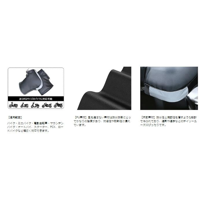 【夜反射シート付き】ハンドルカバーの前方に反射シートがあり、暗い場所でも光を十分反射して安全性を確保します。反射シートがなくても大丈夫と思いきや、実はこの反射シートがバイクからも見えるというのが重要!それだけで防犯意識の高さを示すことができ、不意ないたずらを避けることにもつながります。安全面にも配慮がなされています。