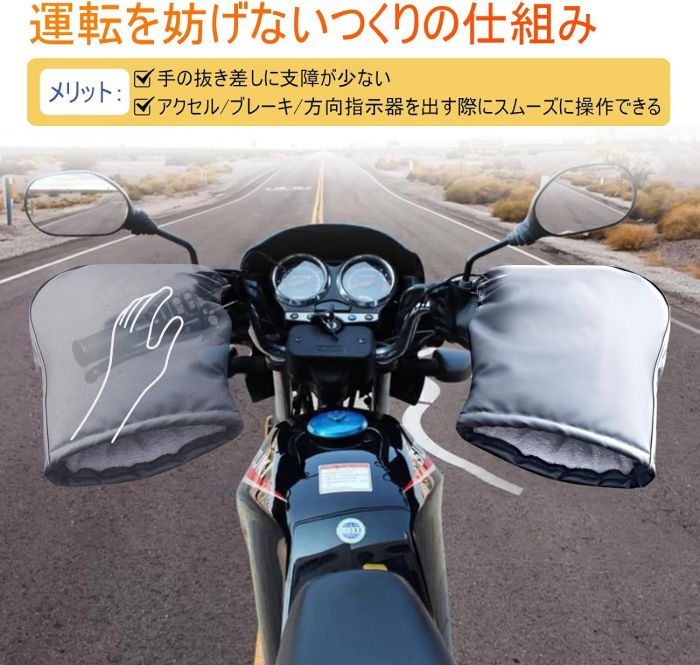 【着脱簡単運転を妨げない】事故や転倒の際、咄嗟にハンドルから手を離せないという2次災害的事故が発生という問題を減らすために、お客様の要望が応じて手首開口部が広く製品を開発しました!手首開口部分が広くて、自由に抜き差しに支障が少なくなっています。走行中にヘルメットのバイザーを開け閉めしたり、ミラーの角度調整をしたりといった運転の癖がある方に適合ます。また、ハンドルカバー内の可動域が広くて、アクセル、ブレーキはもちろん、方向指示器(ウィンカー)を出す際にスムーズに操作します。運転を妨げない!