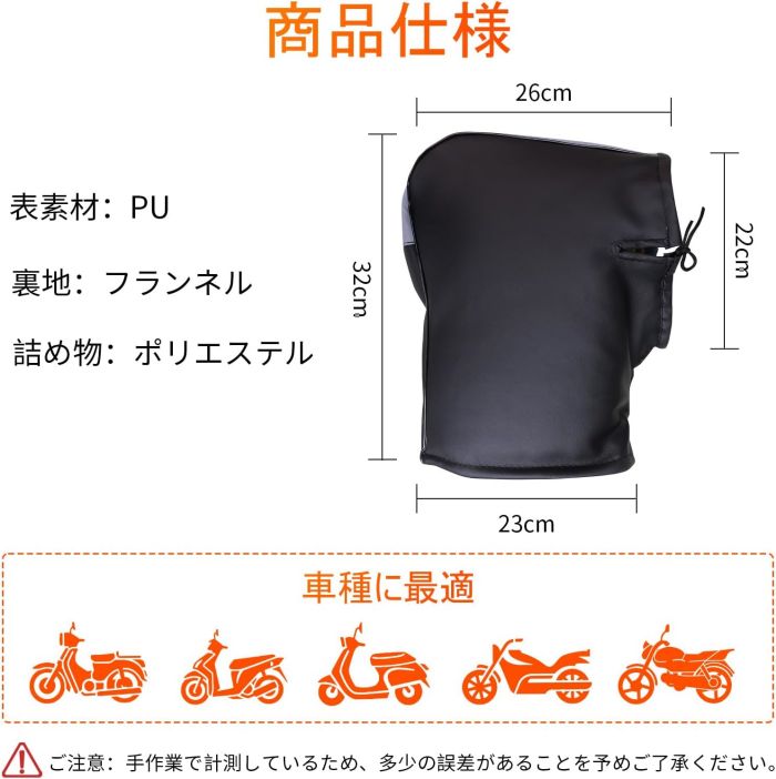 【裏起毛防寒】寒い冬の日に指先が凍りつき、走行難しくなることがあります。寒さから指先を守るために、裏起毛ハンドルカバーが登場しました。表面にに防水性の高いPUレザー素材で覆われており、裏地には保温発熱するフリース素材が使用されて熱が溜められます。冷たさからくる凍結や指の動きの制限を解消し、冷たい風や寒さからくる不快感を排除し、快適で安全な冬のバイクライディングを楽しむことができます。寒冷な天候下でも暖かさと快適さを提供し、バイクライディングのシーズンを楽しむお手伝いをいたします。