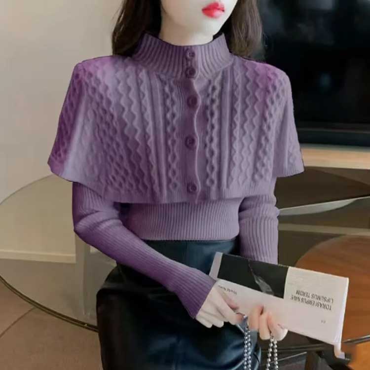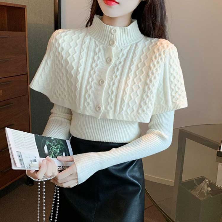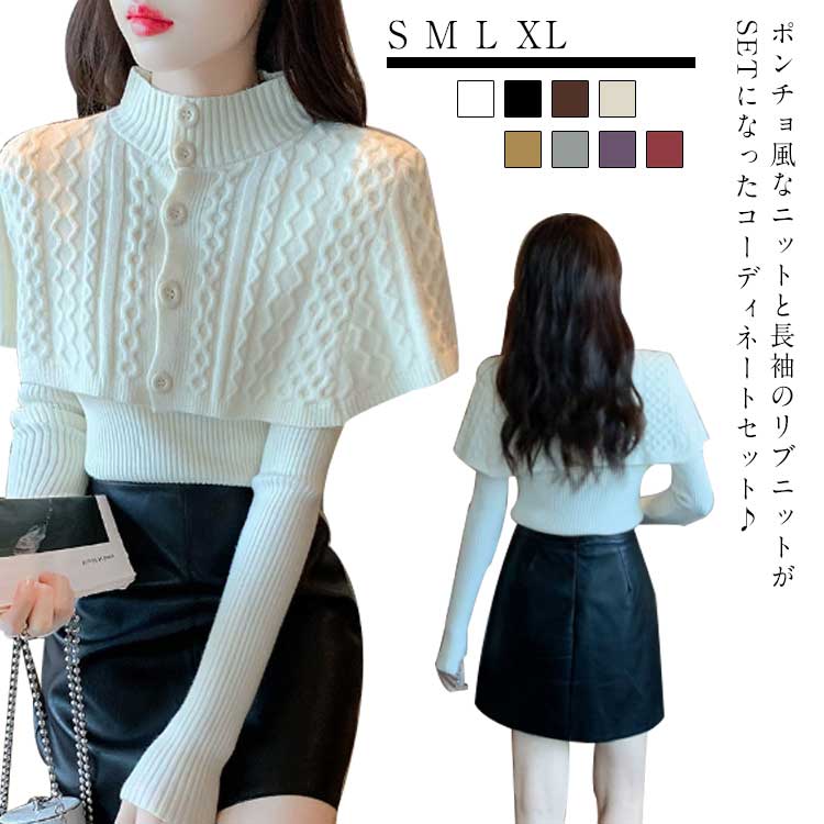 ニットポンチョ×長袖ニット ケープニッ トップス ニット セーター セーター 豊富 ホワイト ブラック ブラウン アイボリー イエロー グレー パープル レッド S-二点セット M-二点セット L-二点セット XL-二点セット
