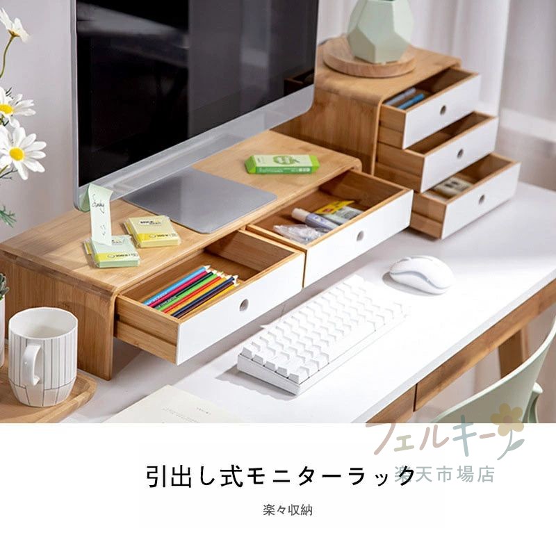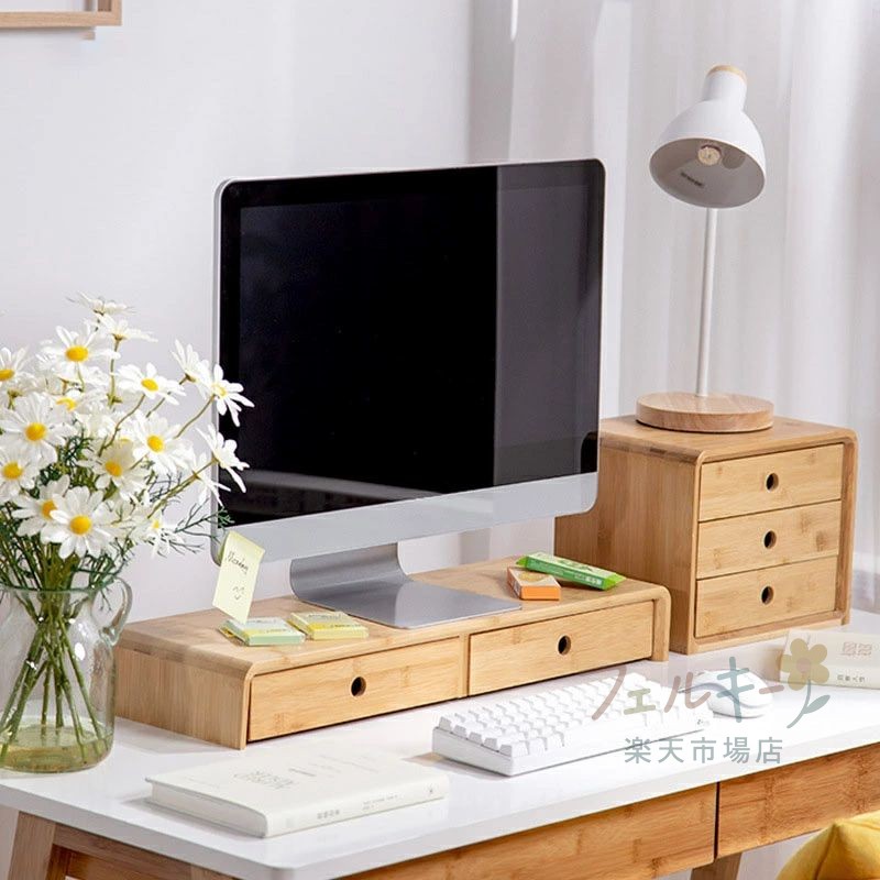 竹製 モニターラック 引出し付き シンプルデザイン 卓上収納 ディスプレイ台 ノートPC台 デスク上スタンド ナチュラル キーボード収納