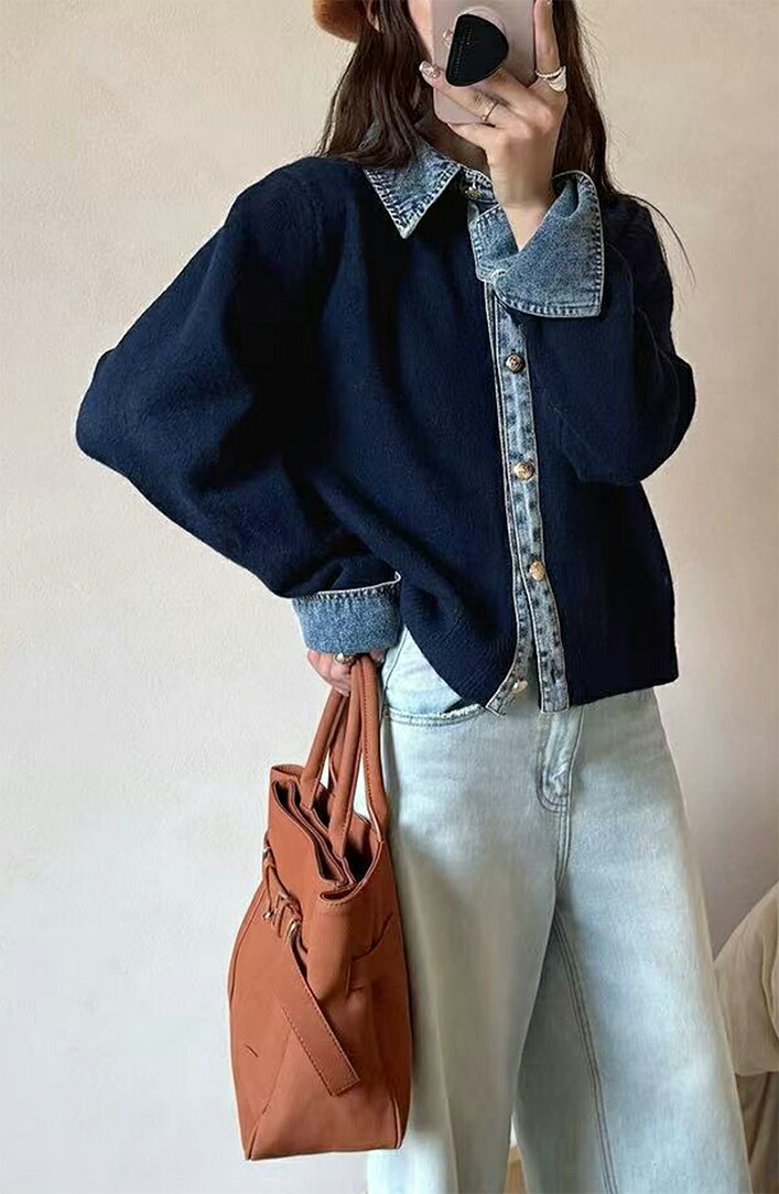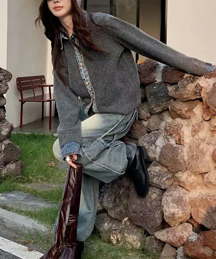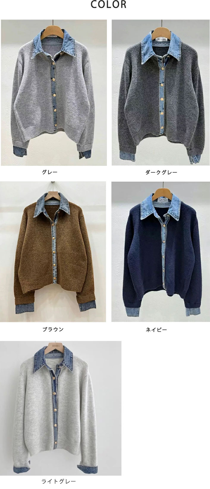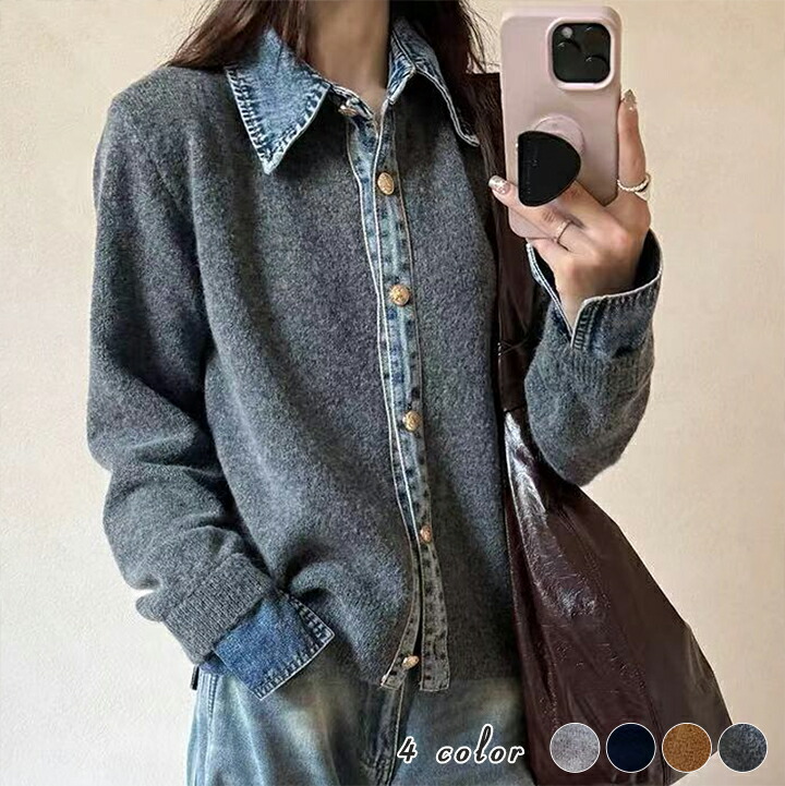 3A44 デニム切り替え ニットカーデ トップス カーディガン ボレロ 早い者勝ち グレー ダークグレー ブラウン ネイビー ライトグレー