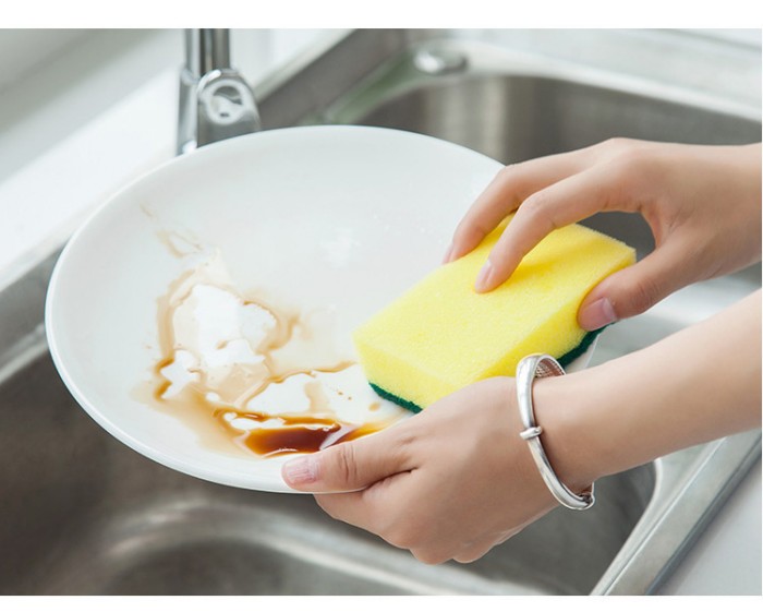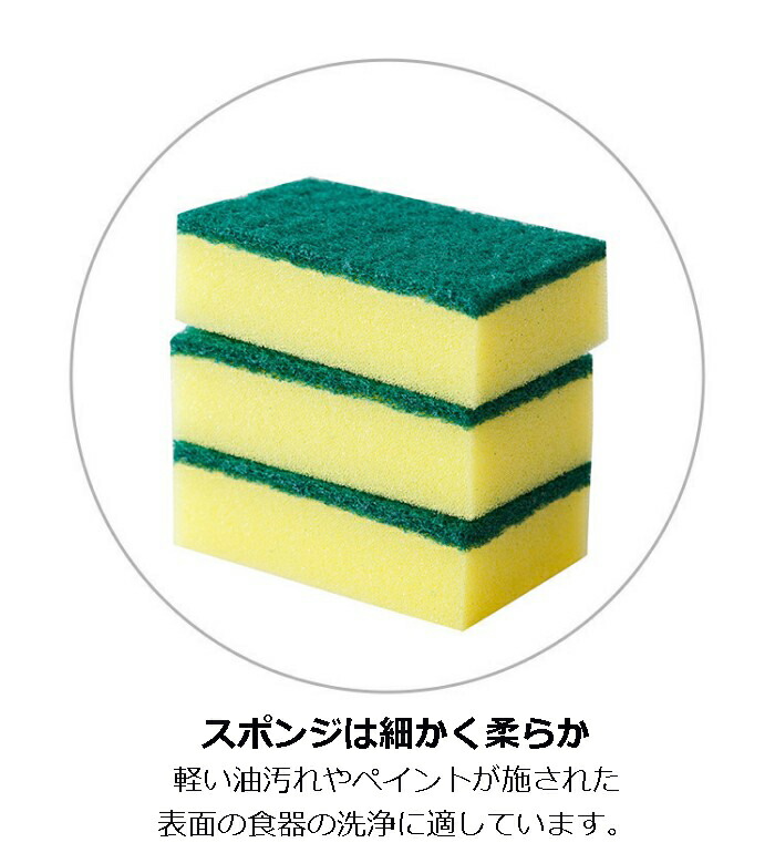 一方の面は、柔らかく細かなメッシュ構造のスポンジ。泡立ちが良く、食器の表面を守りながら汚れを包み込んで浮かせる。もう一方は、しっかりとした不織布。力を込めてこすりたい頑固な汚れに真っ向から立ち向かう研磨力が備わる。