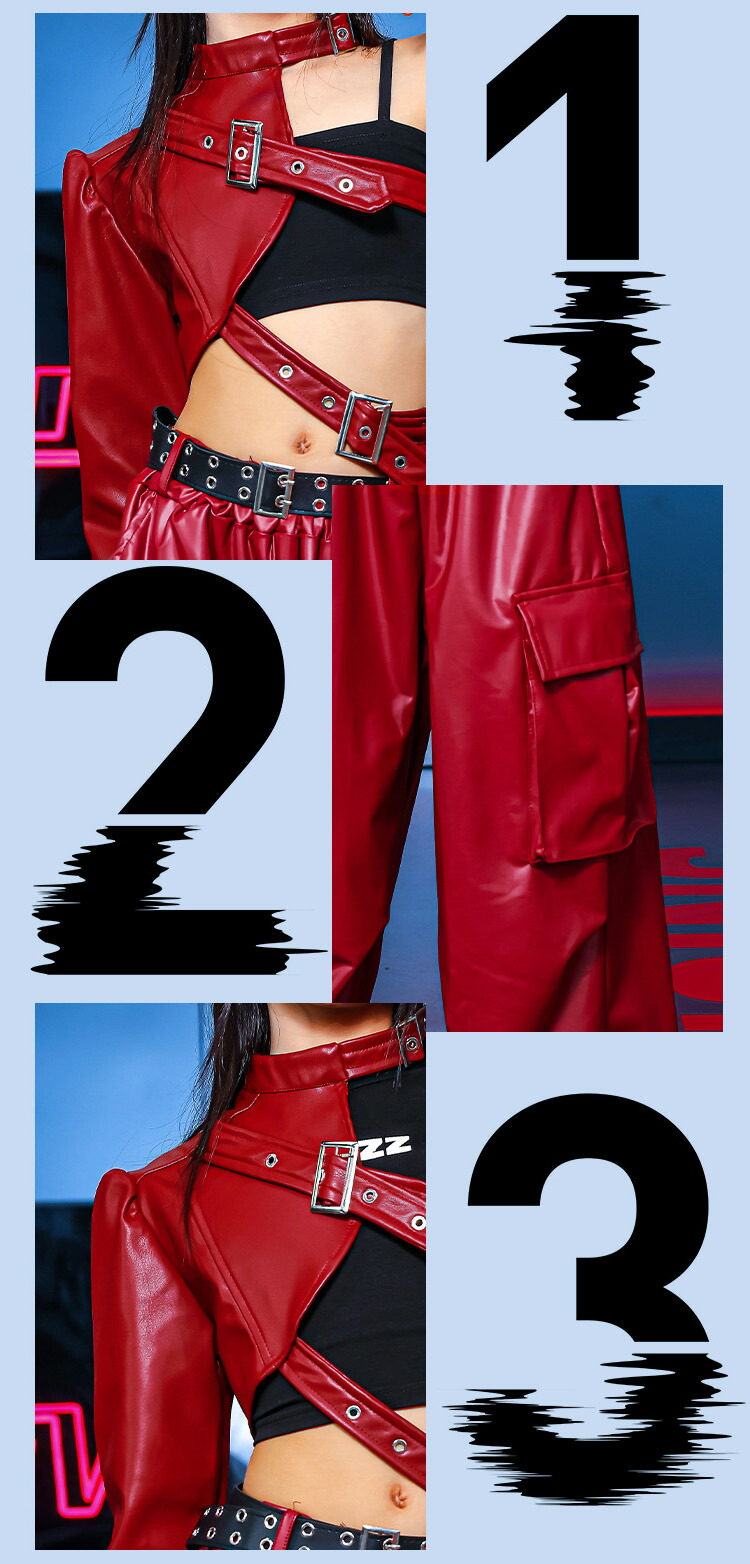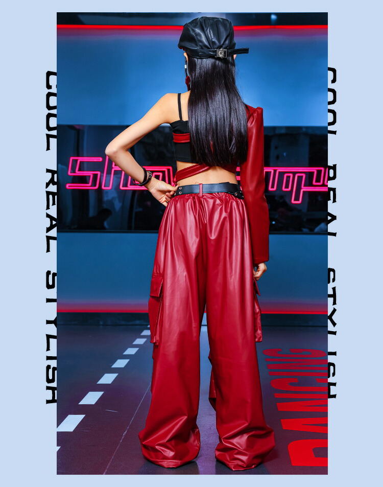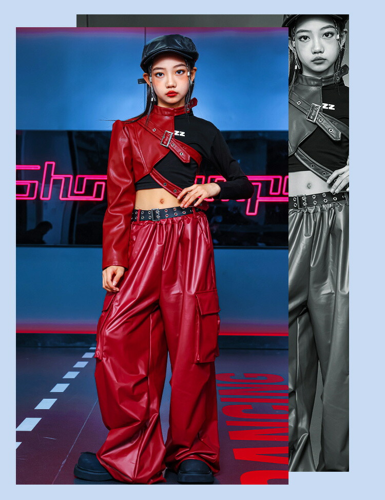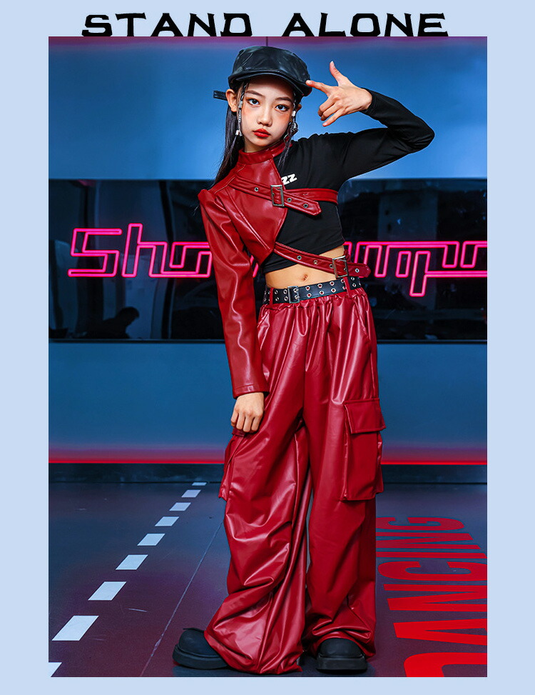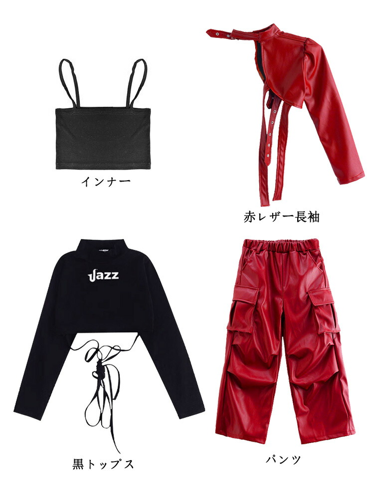 レザー へそ出し レッド ブラック キ キッズ スーツ カジュアルセットアップ カジュアルパンツセット 続々登場 赤レザー長袖単品 パンツ単品 赤レザー長袖+パンツ インナー+赤レザー長袖+パンツ 黒トップス+赤レザー長袖+パンツ 110 120 130 140 150 160 170 180
