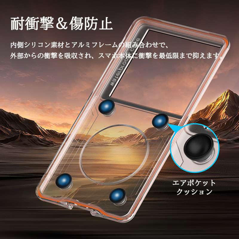このケースはディスプレイ・背面・側面・ボタン・カメラレンズのすべてを覆って、360度オールカバーし、内側シリコン素材とアルミフレームの組み合わせで、外部からの衝撃を吸収され、スマホ本体に衝撃を最低限まで抑えます。