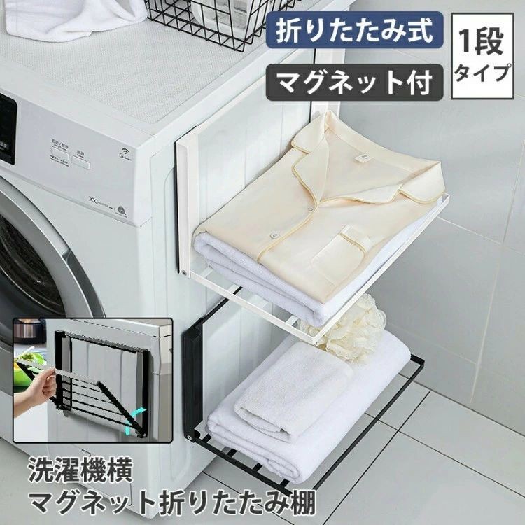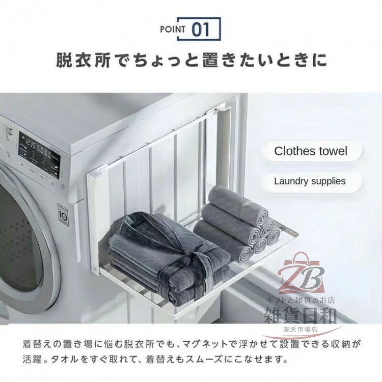 洗濯機横マグネット折り畳み棚 省スペース収納 脱衣所ランドリールーム 衣類置き場 コンパクト設計 バスタオル