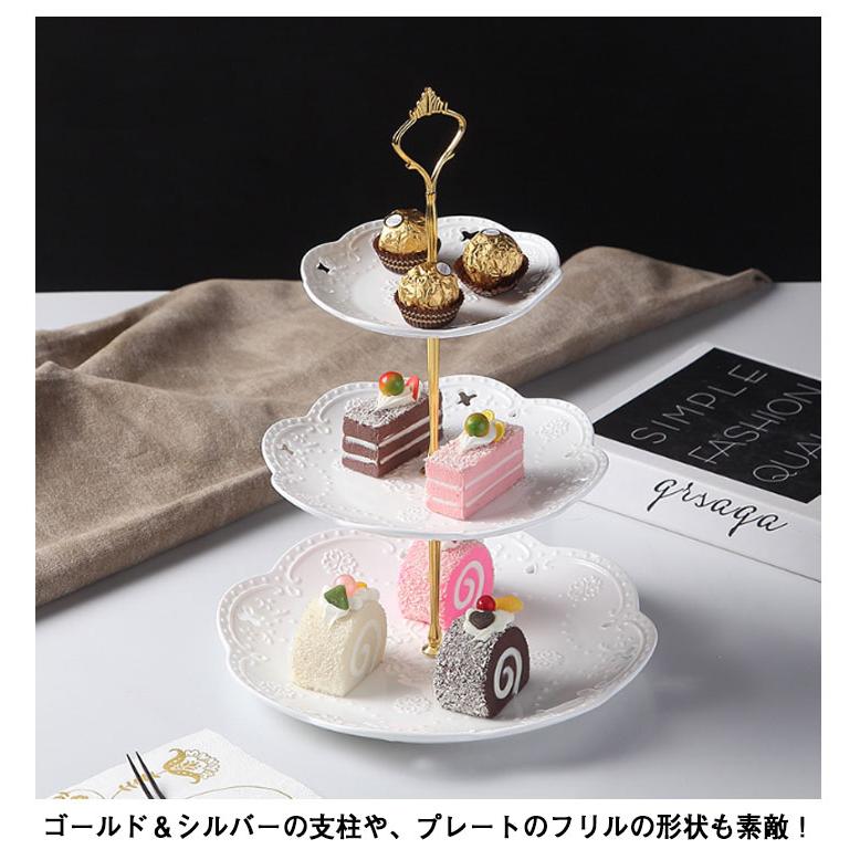お洒落な人気3段プレート。ゴールド&シルバーの支柱や、プレートのフリルの形状も素敵!