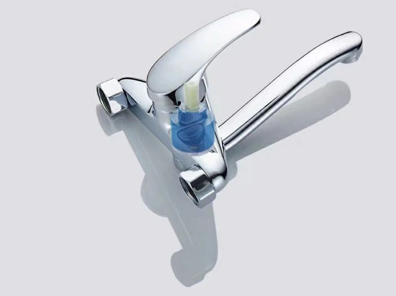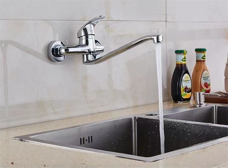 【特徴】壁付き キッチン用シングルレバー混合栓 クロームメッキ&真鍮 吐水口は360°に回転可能。