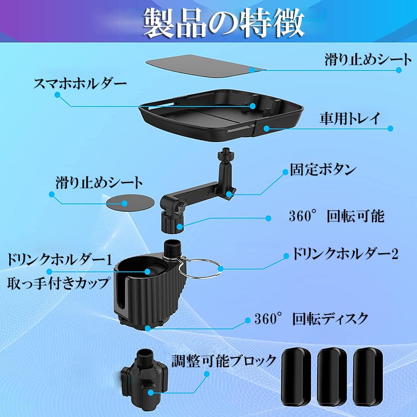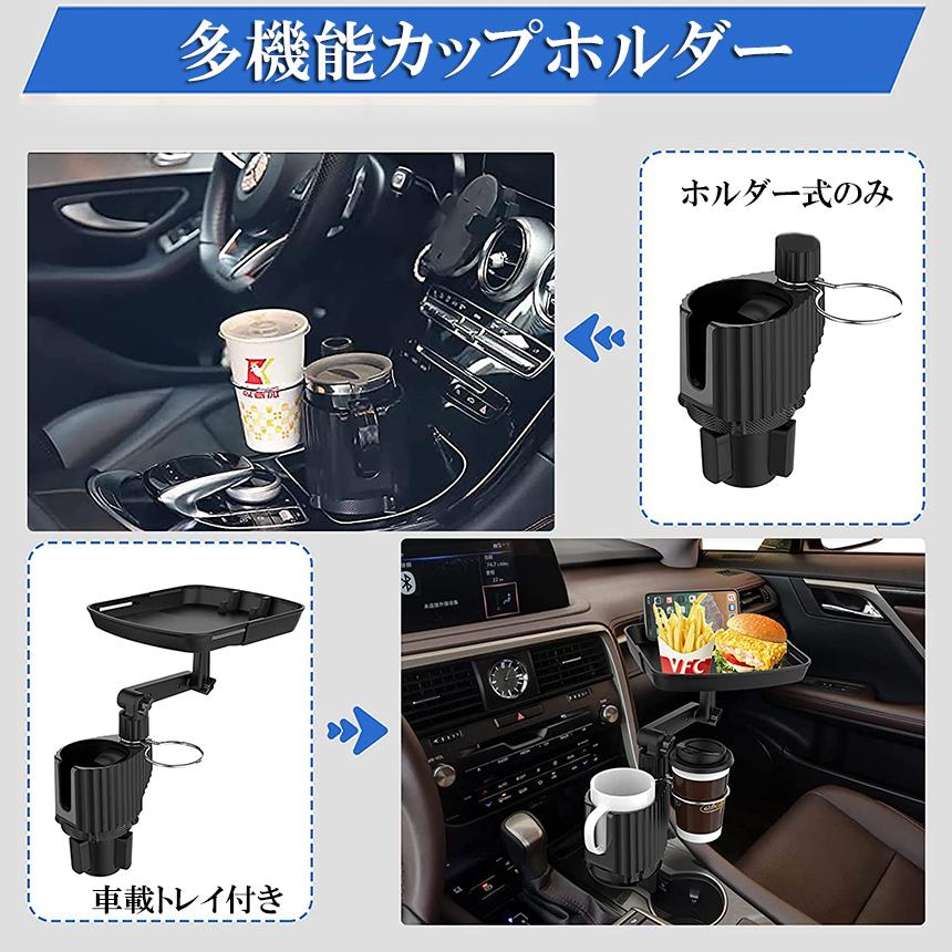ドリンクホルダー トレイ車用 車載トレイ 車用トレイ スマホスタンド カーテーブル 2in1 差し込み式 多機能 360°回転 スマホ 小物入れ 車載 滑り止めシート 収納 車用 回転 ダブルカ 車内