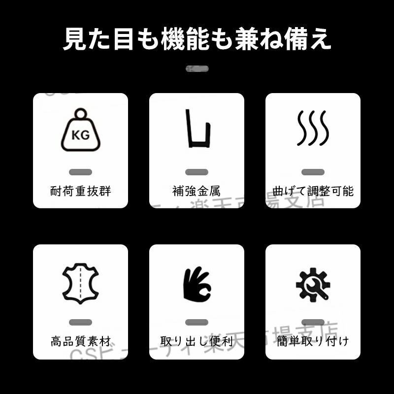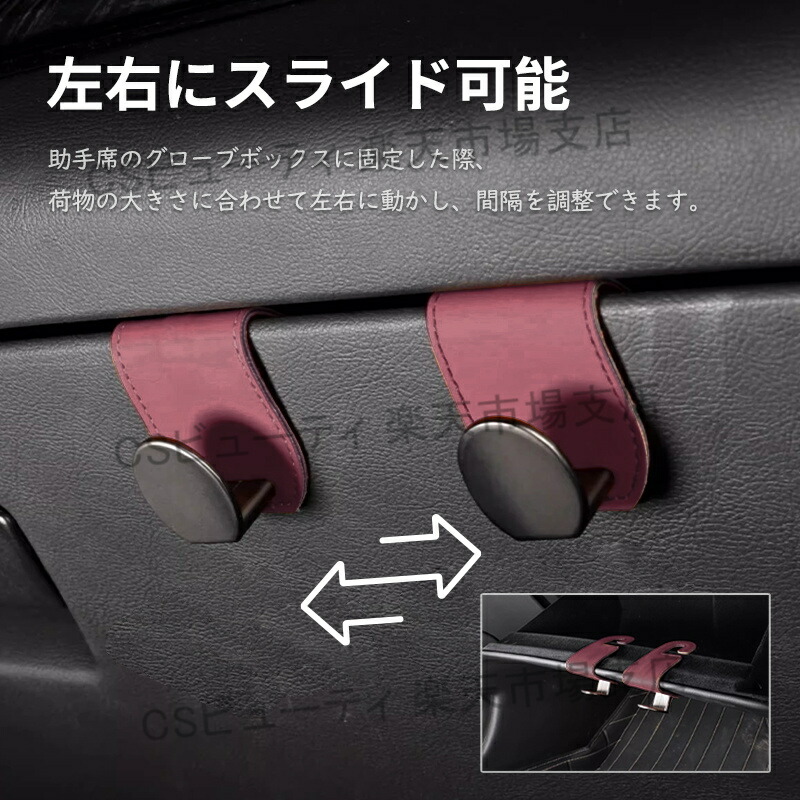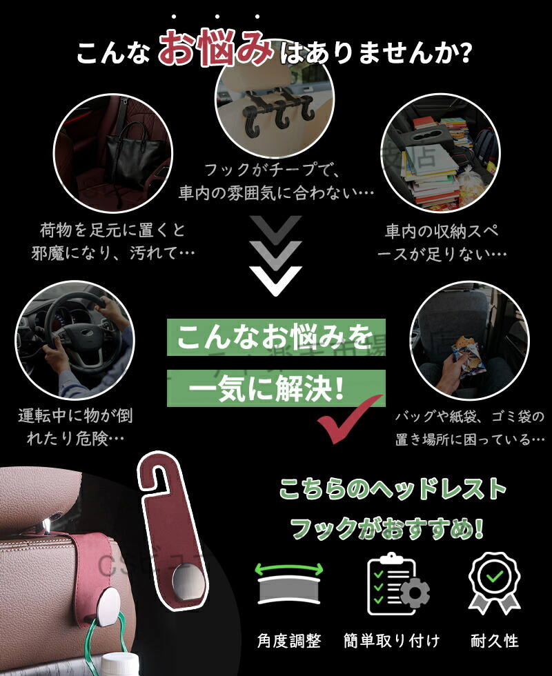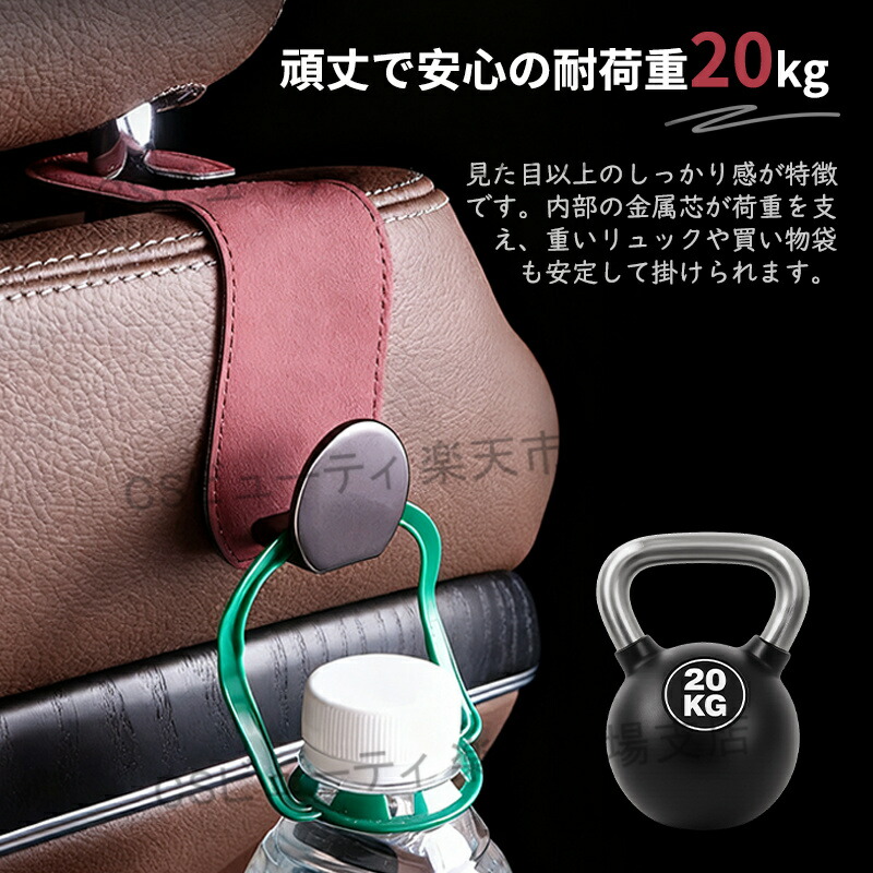 コンビニ袋、買い物袋、リュック、ハンドバッグ、水筒、傘など様々な荷物を掛けられ、車内の整理整頓に便利。