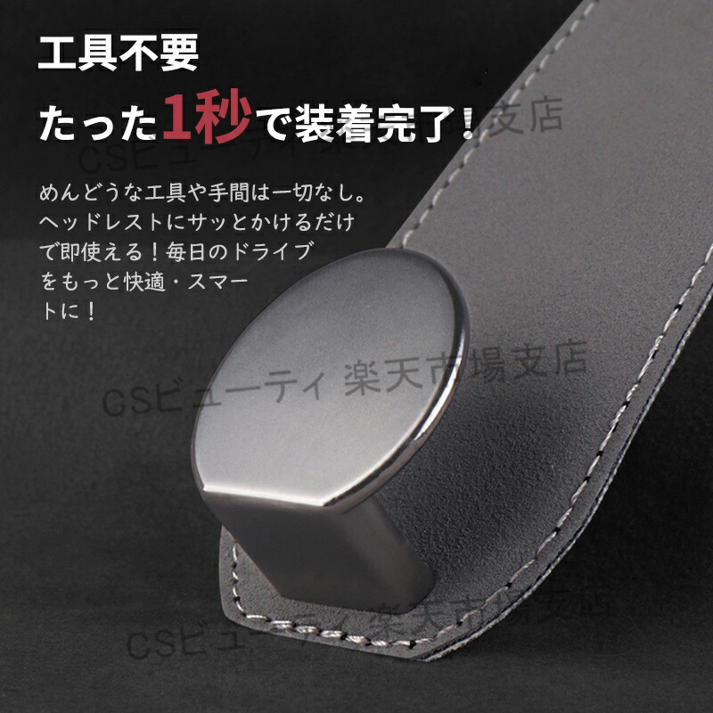 ヘッドレストのポールに差し込むだけで、工具不要で誰でも簡単に装着可能。