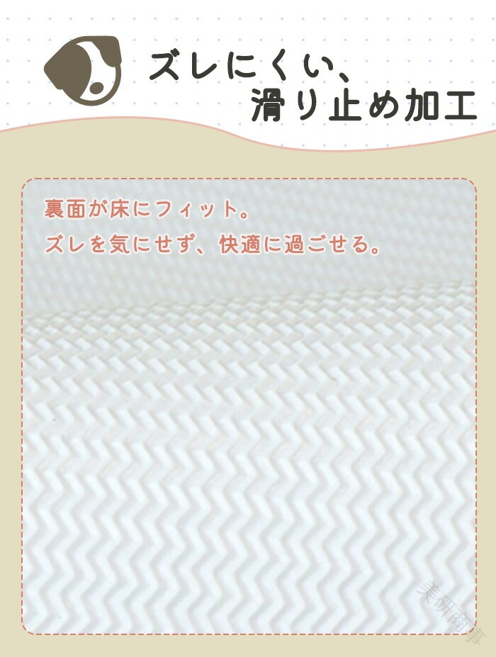 製造元:中国カラー:4タイプ(画像にご参照)【汚れ知らず、お手入れはサッと拭くだけ】「粗相しちゃった…」そんな時も大丈夫。水分や汚れを弾く素材なので、サッとひと拭きでキレイになる。洗濯の手間もなく、いつでも清潔な空間を保てる。【丈夫で長持ち、元気な子も安心】やんちゃな子が爪でカリカリしたり、噛んだりしても大丈夫。傷つきにくく、型崩れもしにくい高耐久仕様で、長く使える。【ズレないから、滑らない・危なくない】裏面の特殊な凹凸が床に吸着し、マットのズレを防止。元気な子が走り回っても滑りにくく、ケガの心配を減らす。掃除機がけもスムーズ。