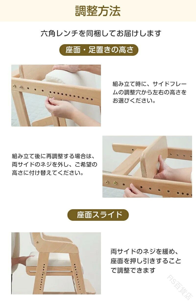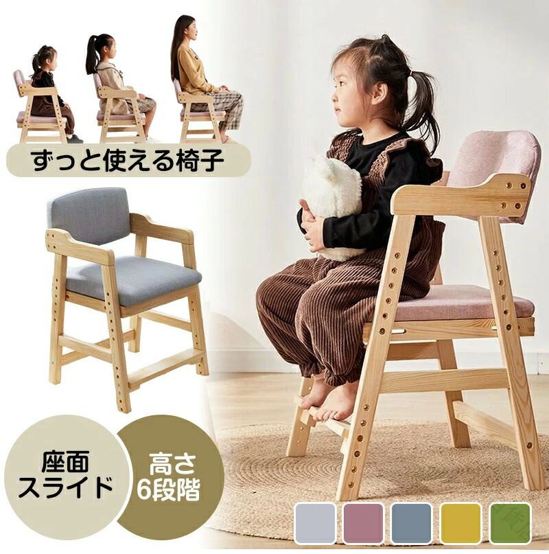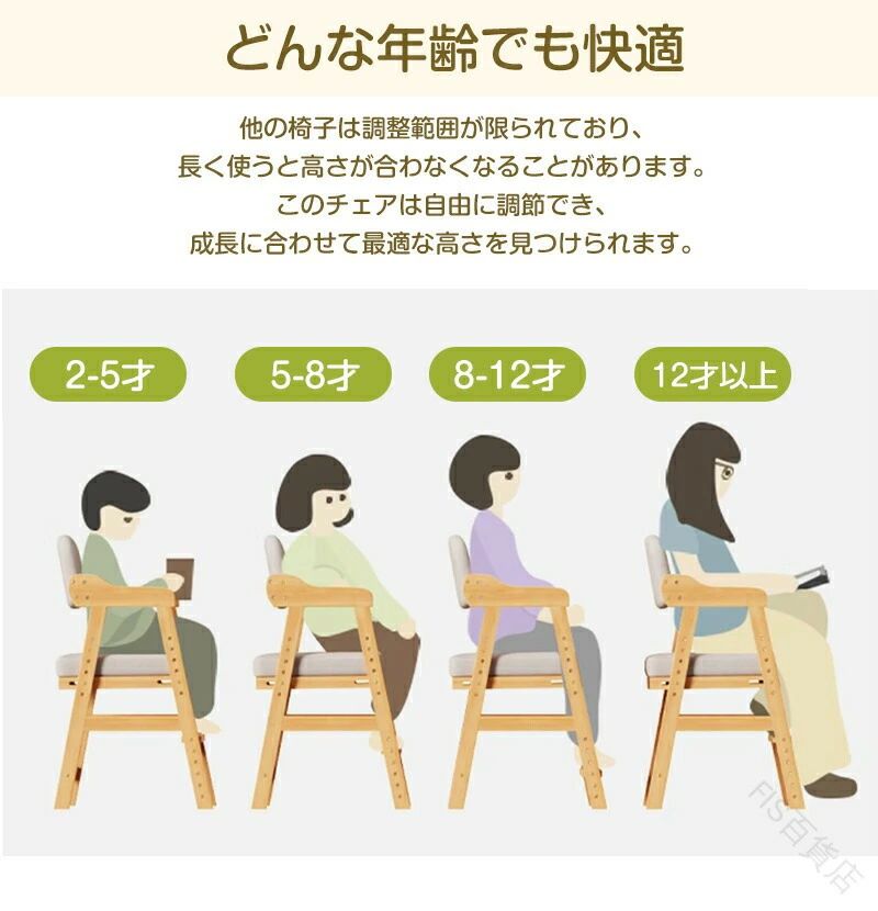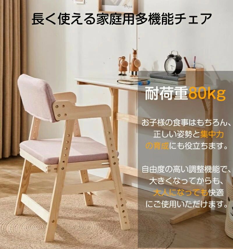 長く使える成長対応設計2歳~12歳まで快適に座れる、高さ調節機能付き。机に合わせて高さ調整座面高さ40~55cm、あらゆる机と平行に。正しい姿勢をサポート膝90度を保ち、集中力アップ。座面スライド&フットレスト成長に合わせて常に正しい姿勢をキープ。安心の丸角デザイン小さなお子様にも安全な全身丸角加工。天然木のぬくもり上質な手触りと安心感。お手入れ簡単座面カバーは取り外して洗濯可能。耐荷重80kg大人も座れる頑丈設計。簡単高さ調整六角レンチ付きで楽々調整。