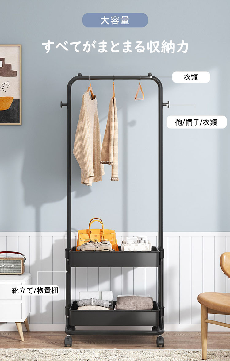 ※小物からロングコートまで:高さ150cmで、丈の長い衣類にも対応!両サイドの突起には、バッグや帽子なども掛けられます。下部には収納ボックスや靴などを置くことが可能。スペースを無駄なく活用できます。