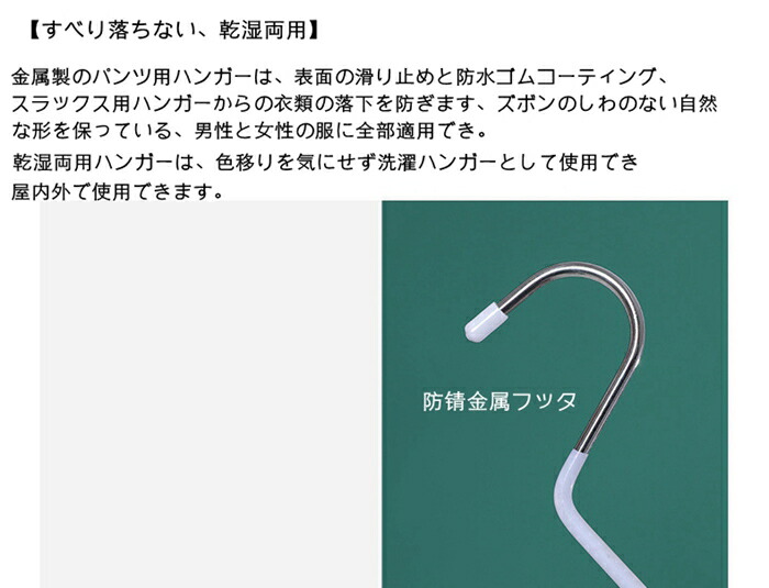 【すべり落ちない、乾湿両用】金属製のパンツ用ハンガーは、表面の滑り止めと防水ゴムコーティング、スラックス用ハンガーからの衣類の落下を防ぎます、ズボンのしわのない自然な形を保っている、男性と女性の服に全部適用でき。乾湿両用ハンガーは、色移りを気にせず洗濯ハンガーとして使用でき、屋内外で使用できます。