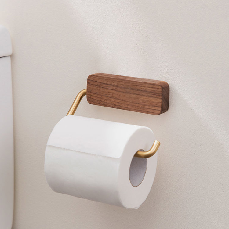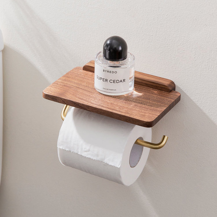 美しい木目の黒胡桃木棚と高級感溢れる金色のステンレスの組み合わせがとってもおしゃれなトイレットペーパーホルダーです。
