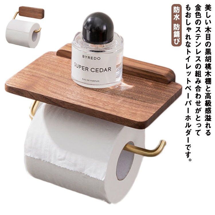 トイレットペーパーホルダー シングル 1連 棚付き 木製 ステンレス おしゃれ 北欧 防水 防錆び モダン アンティーク 木目 ゴールド ナチュナル 自然 高級感 取付簡単 シンプル 自宅 穴あけ不要