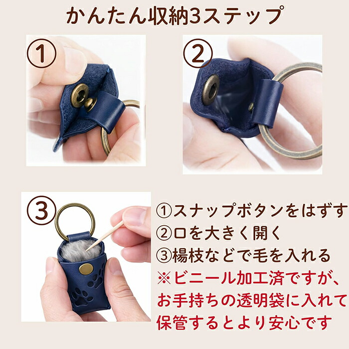 本体前面には透明ビニールを縫い留めており、毛が外に触れにくい構造ですが、スナップボタン部分の隙間から細い毛が出る場合があります。 気になる場合は、小さなビニール袋に入れてから収納するのがおすすめです