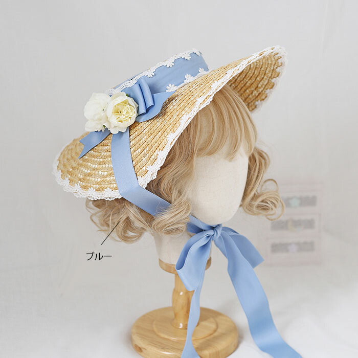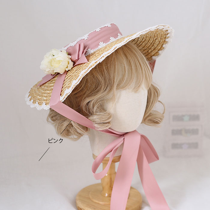 ヘッドドレス カンカン帽 帽子 ハット 麦わら帽子 レース リボン 顎リボンつき