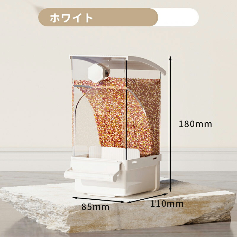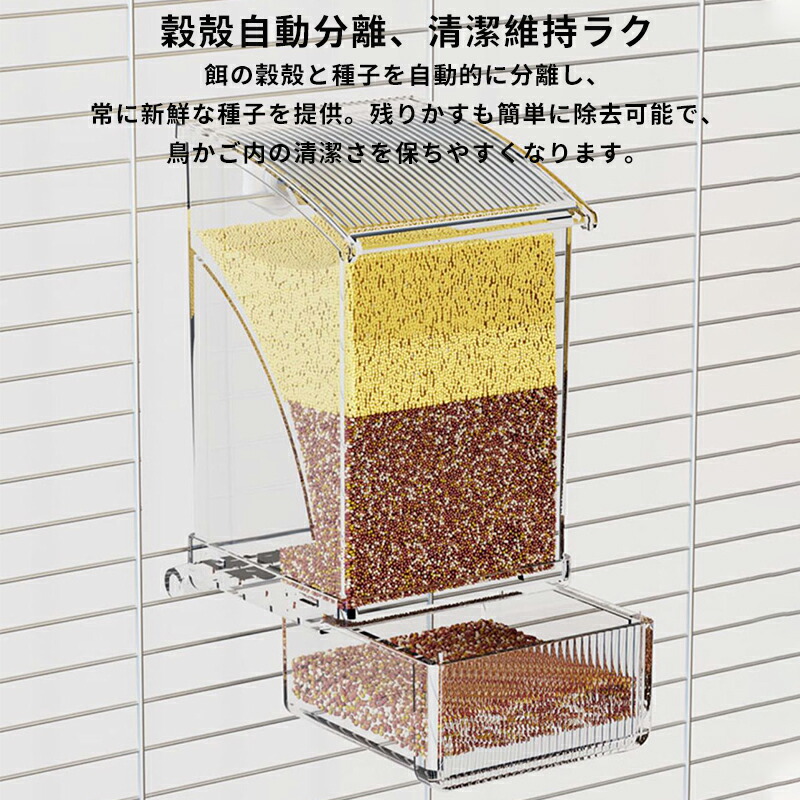 餌の穀殻と種子を自動的に分離し、常に新鮮な種子を提供。残りかすも簡単に除去可能で、鳥かご内の清潔さを保ちやすくなります。
