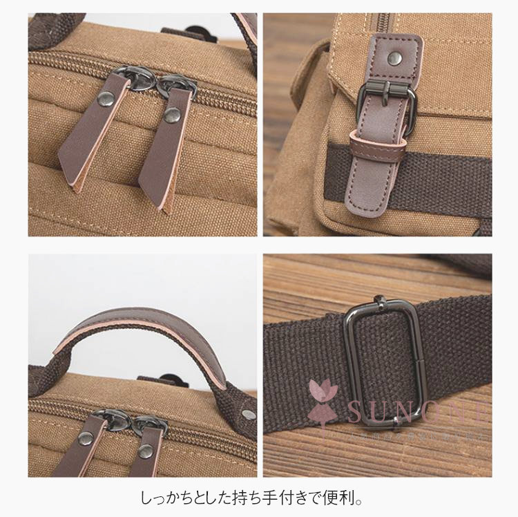 男女問わない高いデザイン性と、機能性を備えたキャンバスバッグ。多機能かつ大容量の便利な2WAYワンショルダー&リュックタイプです。サイド部にはスマホやデジカメがすっぽり収まるポケット付きです。しっかちとした持ち手付きで便利。B5サイズの書籍もスッと入るので大きめの手帳が学習ノートの持ち運びにも最適です。通勤・通学・お出掛け・旅行・アウトドアなど幅広いシーンで大活躍します。