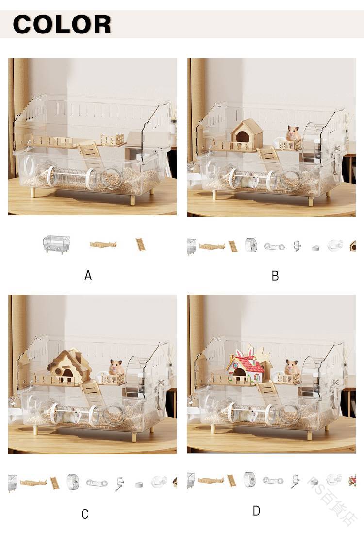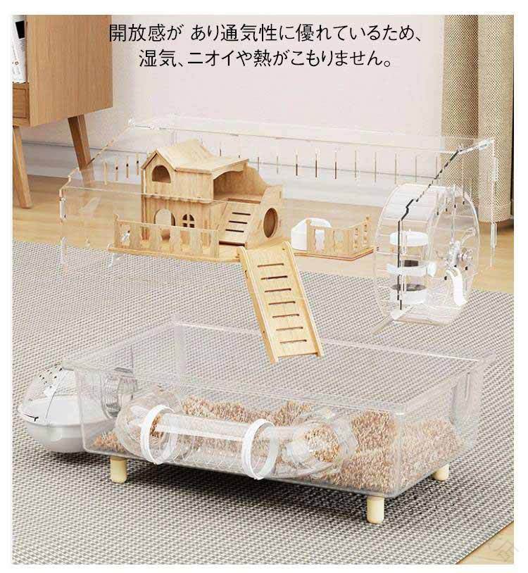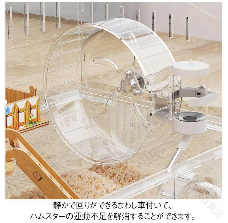 【ハムスター用ケージ 2階建て 透明 組立簡単】広々アクリルケージでハムスターの楽園を!脱走防止&静音設計で多頭飼いも安心。お手入れ簡単なフルセットだから、初心者もすぐスタート。ケージ本体、給水ボトル、餌入れ、ハウス、お風呂などで構成されています。高級ヴィラのような二階建てのデザインで、ペットが快適に過ごせるスペースを確保しています。静かで回りができるまわし車付いて、ハムスターの運動不足を解消することができます。どの角度からでもペットの動きが見え、楽しい観察時間を提供します。ペットの遊びや休息を見守ることができます。丸まって眠っているハムちゃんがうっすら見えて、とてもかわいいです。ケージの屋上と両側は通気穴がたくさん付き、通気性抜群で、風通しが良い、蒸し暑さを防ぎ、ハムスターを快適にする。開放感が あり通気性に優れているため、湿気、ニオイや熱がこもりません。ケージはバックルで固定され、簡単分離ができます。引っ越しや収納運送にも便利です。一回で木屑やゴミを出すことできます。衛生的な住まいを提供し、ペットの健康をサポートします。