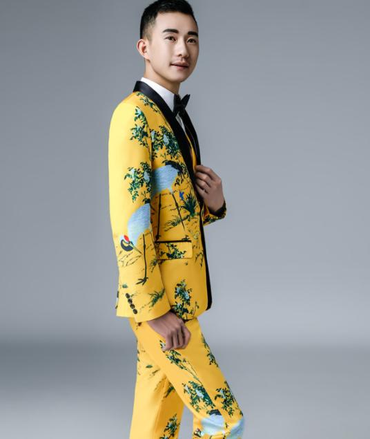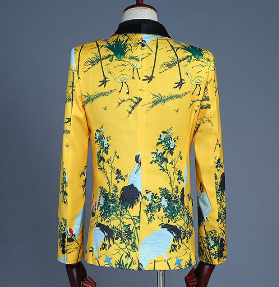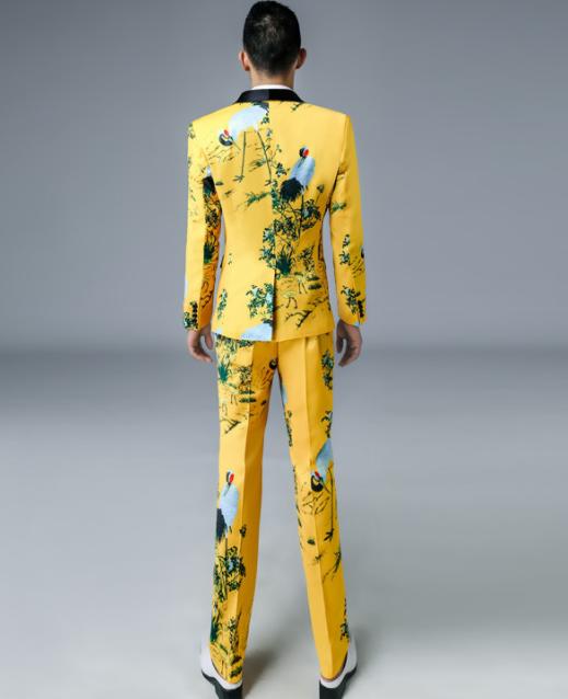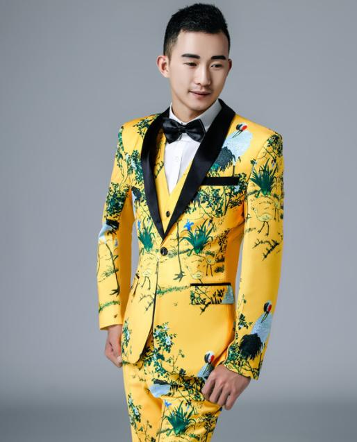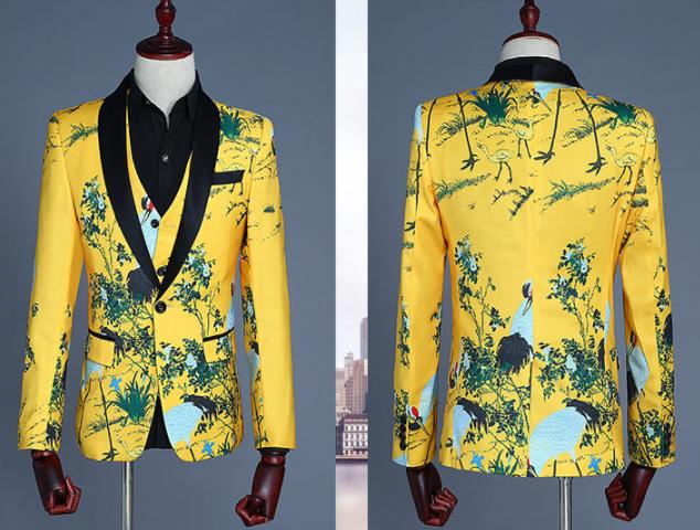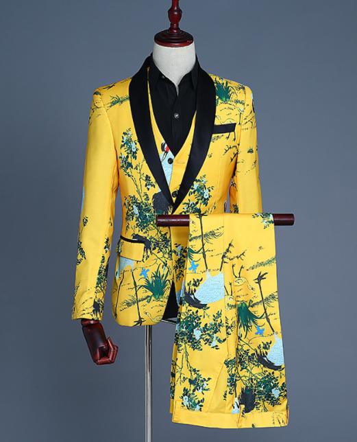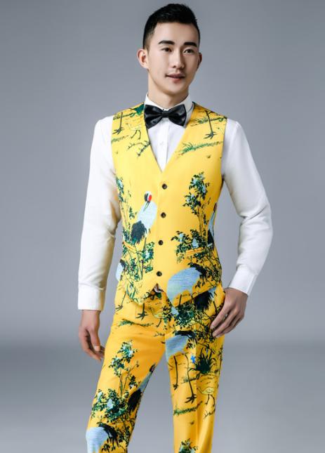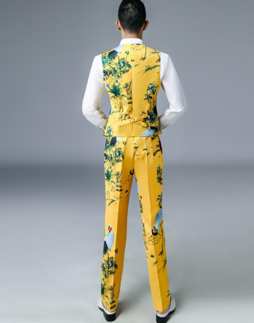 黄色メンズスーツ三点セット 豪華花柄プリントスーツセット花柄ジレベスト+パンツ+テーラードジャケット紳士服鶴プリントタキシード結婚式披露宴新郎花婿フォマールウエア舞台ステージ服司会者派手演出服