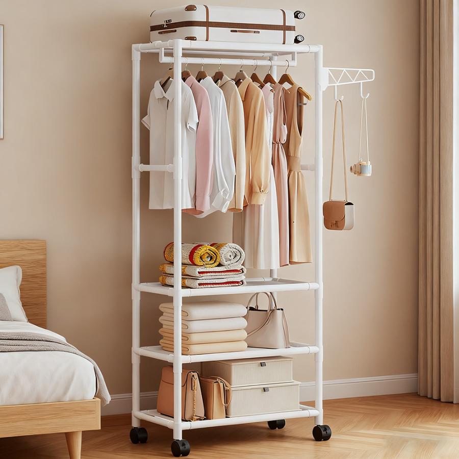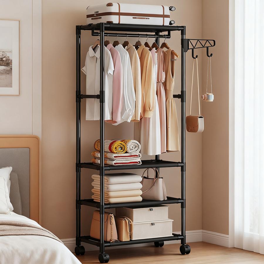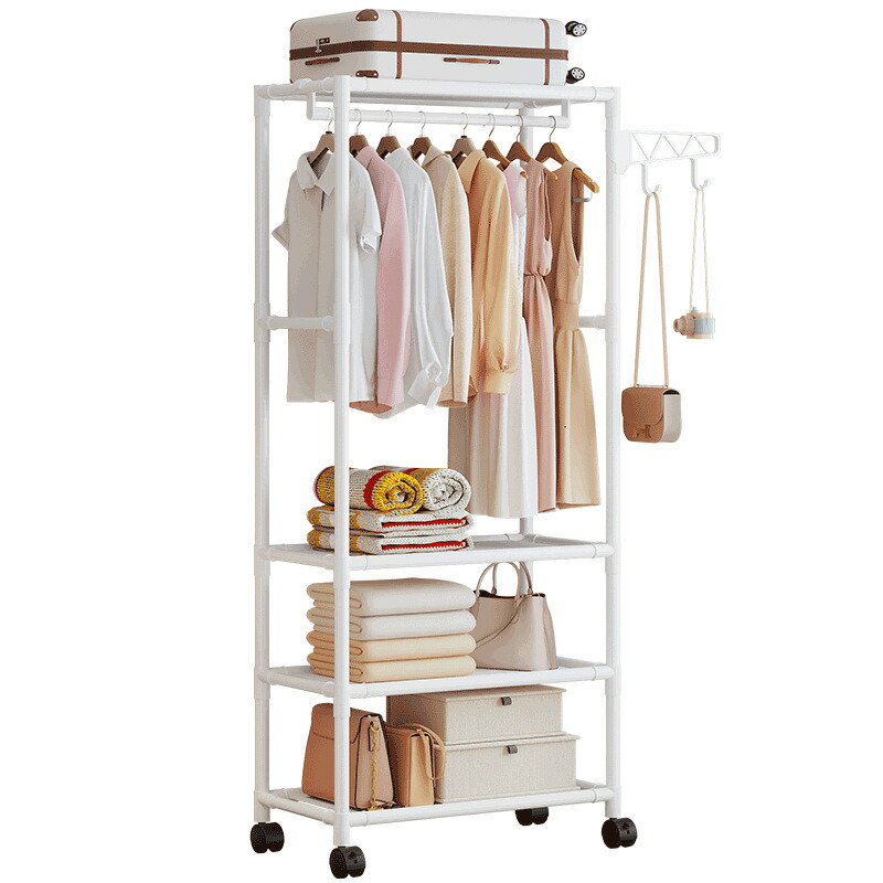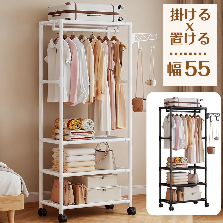 ハンガーラック 多機能 衣類収納ラック 3段収納棚付き キャスター付き スリム幅55cm フック付き 省スペース収納 シンプル 組立簡単 洋服掛け クローゼット収納