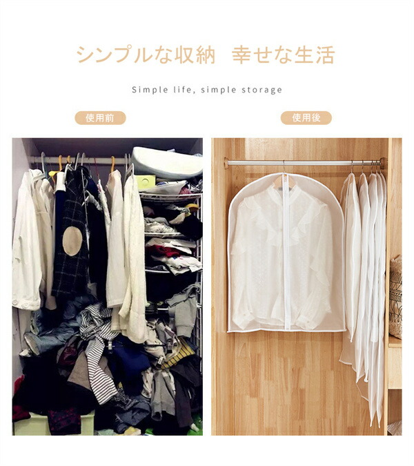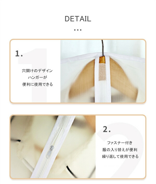半透明のデザインで、中身が見やすいで、衣服を見つけて保管するのが簡単です。ファスナーが付き、ハンガーのフックを通す穴ありますので衣類の出し入れが簡単で便利です