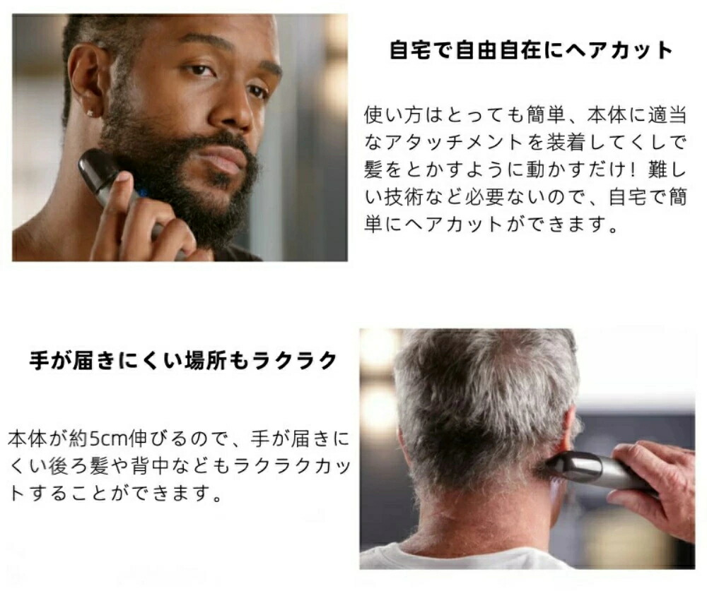 本体が約5cm伸びるので、手が届きにくい後ろ髪や背中などもラクラクカットすることができます。