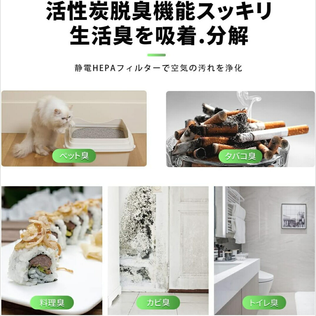 吸着スピードが早い良質な吸着素材活性炭を採用し、トイレのニオイ、生ゴミのニオイ、ペットのニオイなどの生活臭を効果的に除去し、空気がつねに綺麗に
