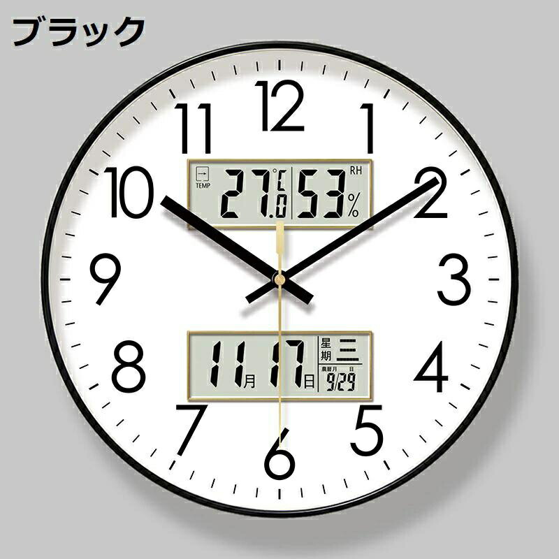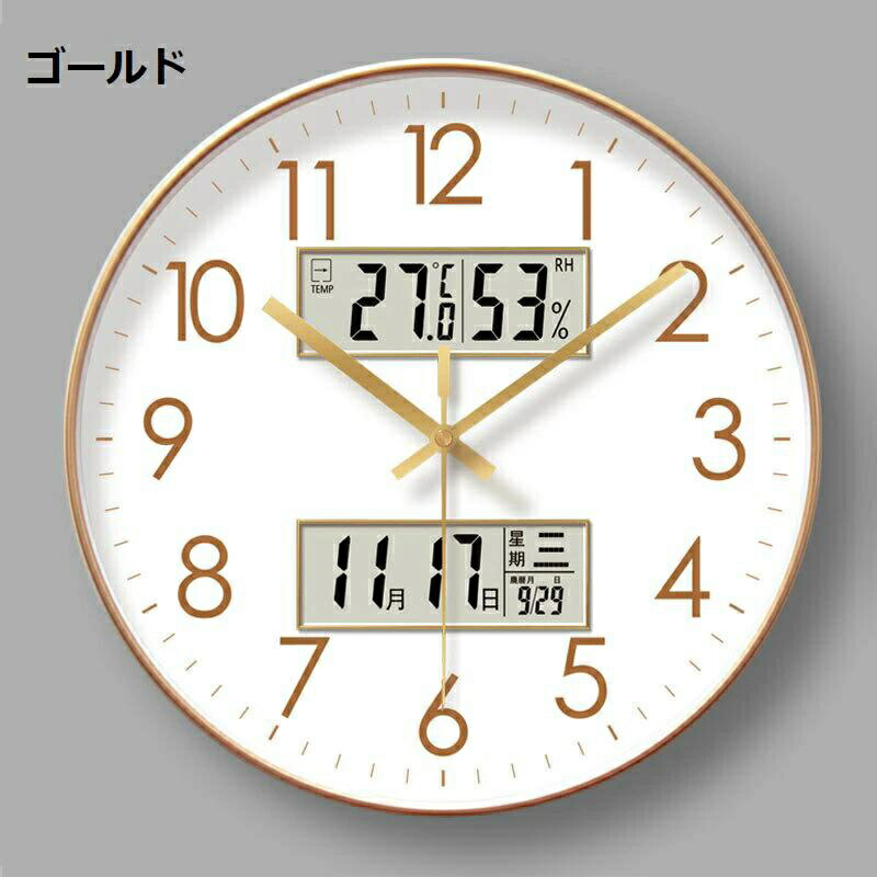 壁掛け時計 アナログ 掛け時計 温度 湿度 カレンダー デジタル LCD ディスプレイ 静音 連続秒針 温度計 湿度計 軽量 北欧 壁掛け 掛時計